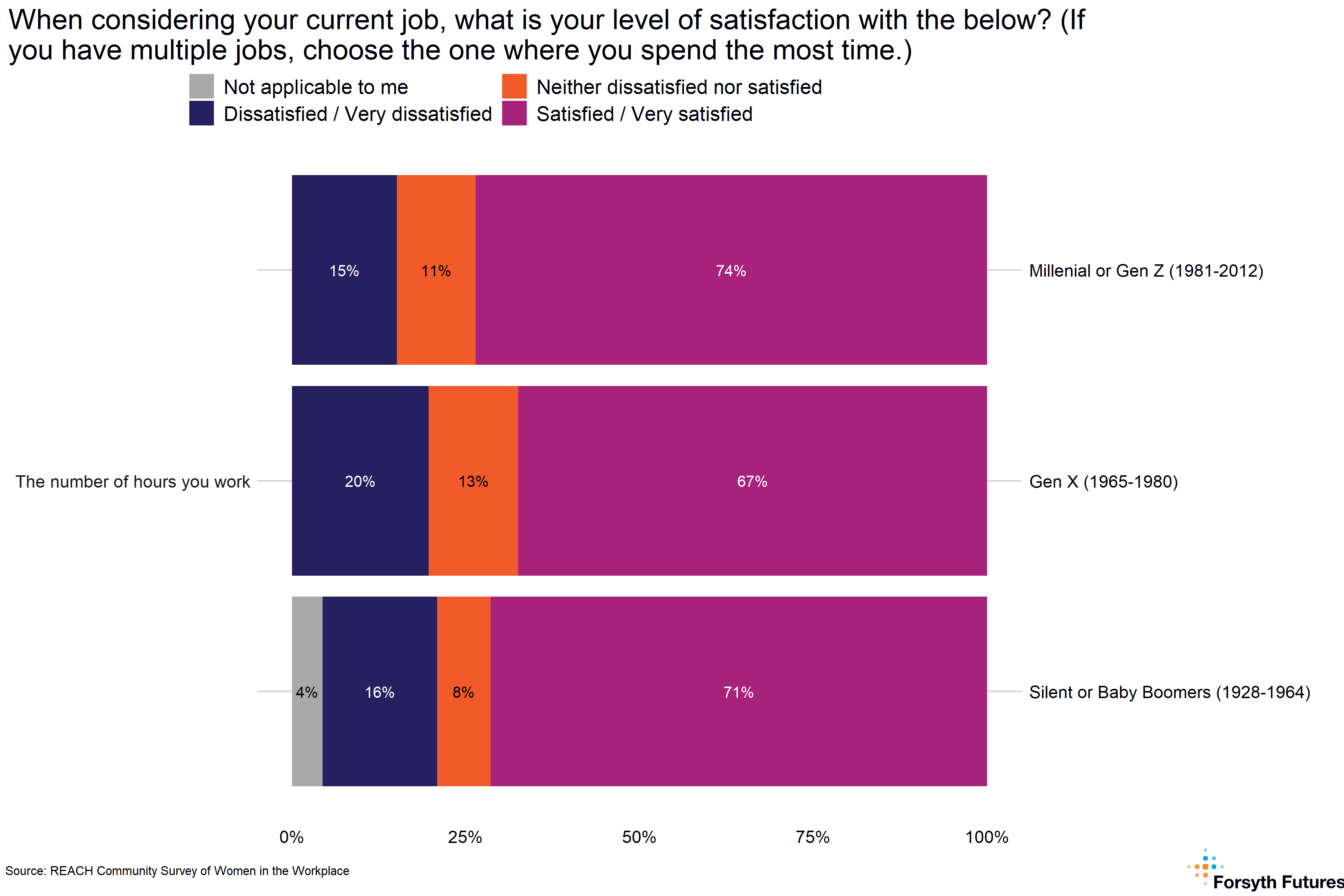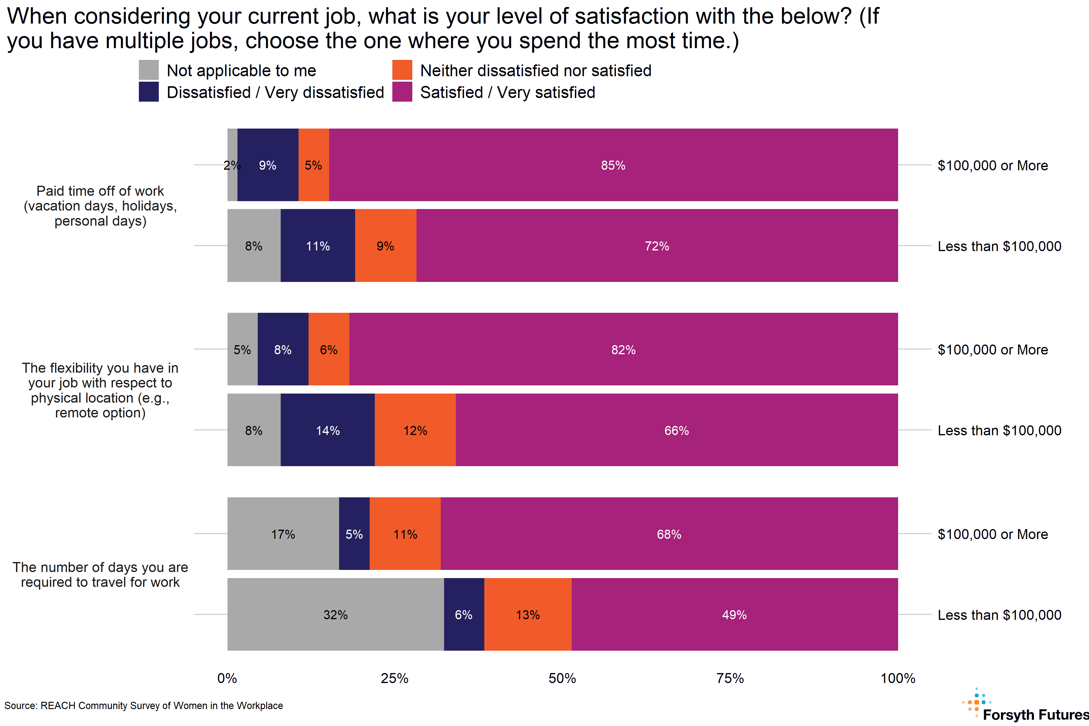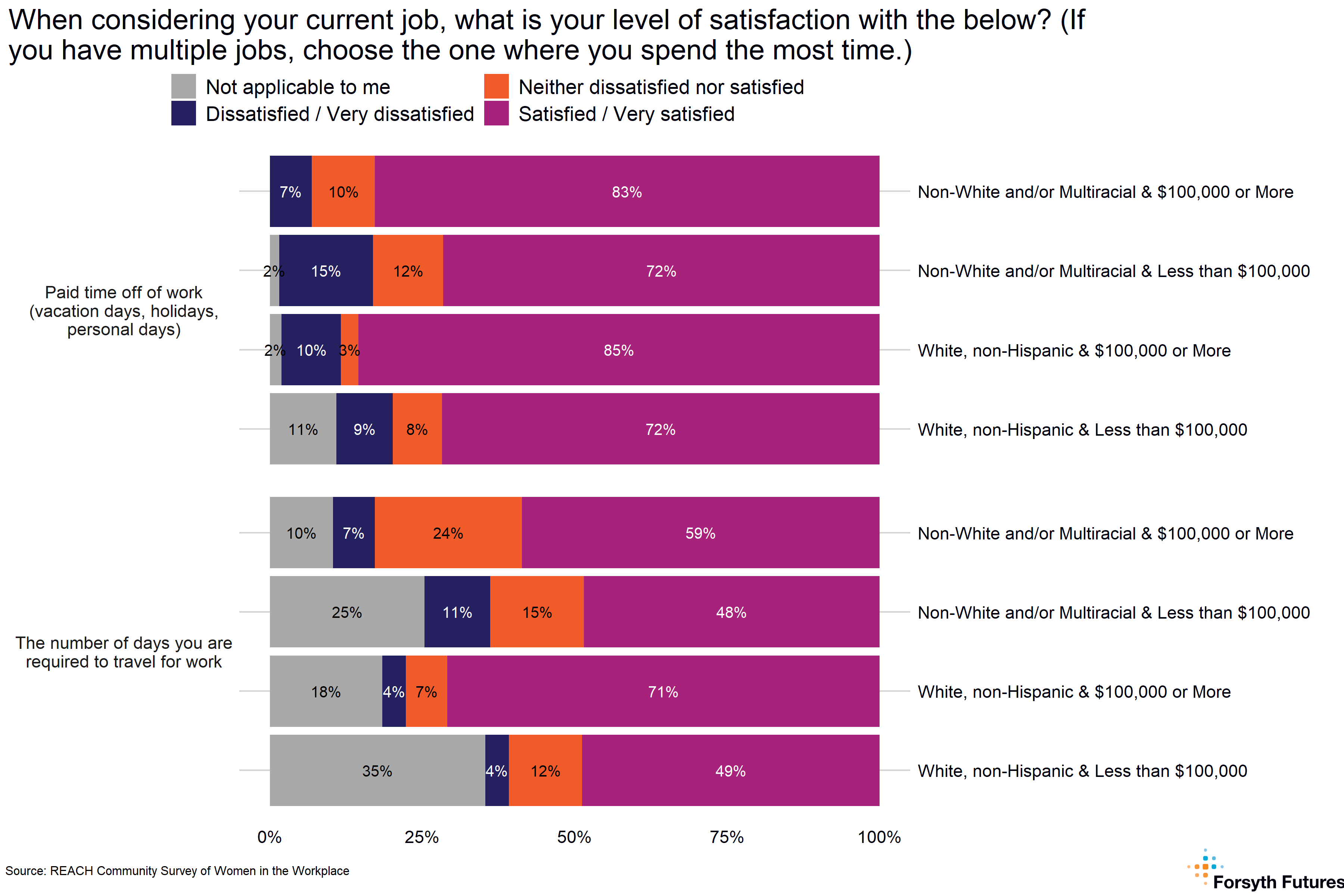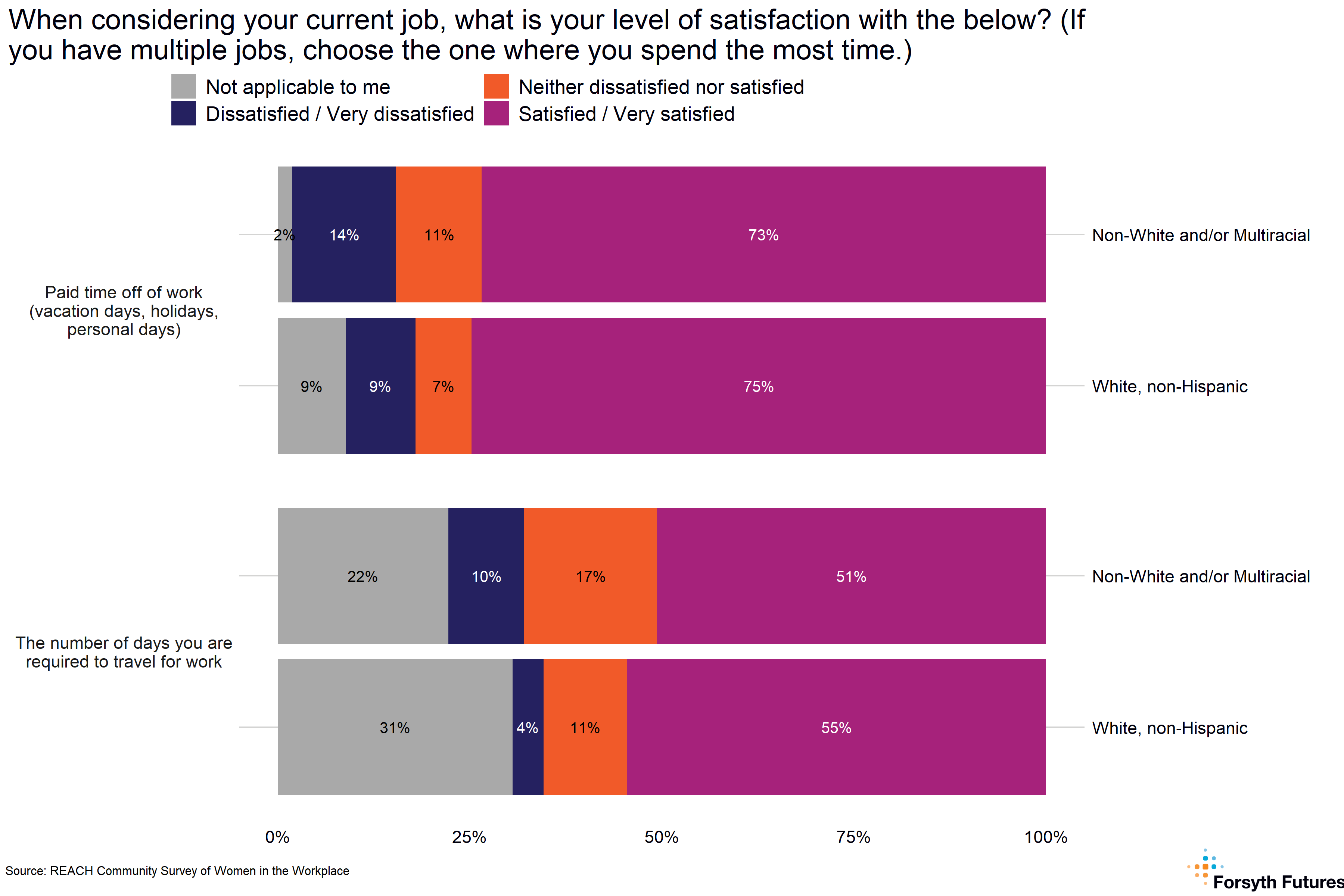 - When rating different aspects of satisfaction with their jobs, women from different backgrounds reported different satisfaction levels the most consistently when rating their paid time off and flexible working opportunities.