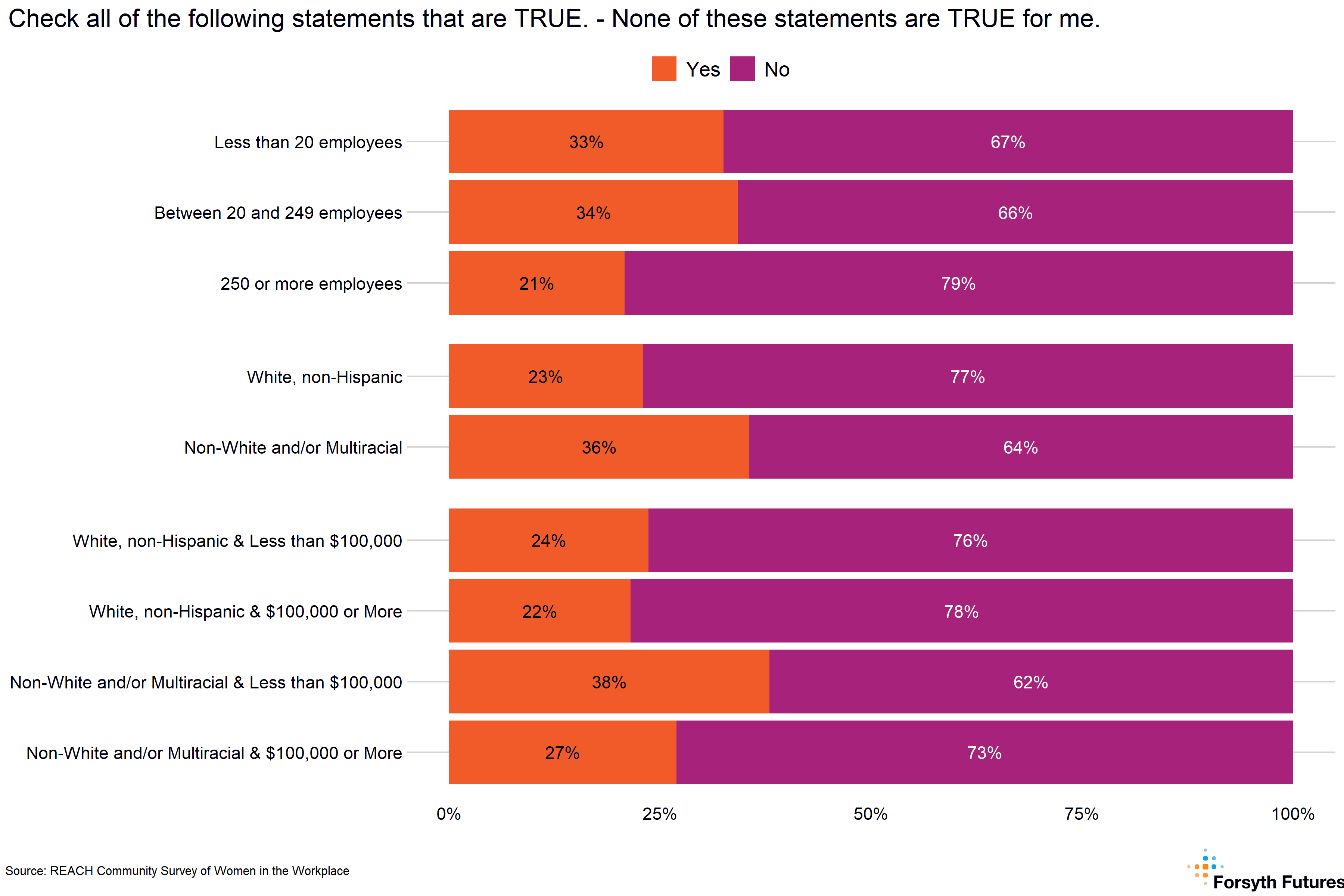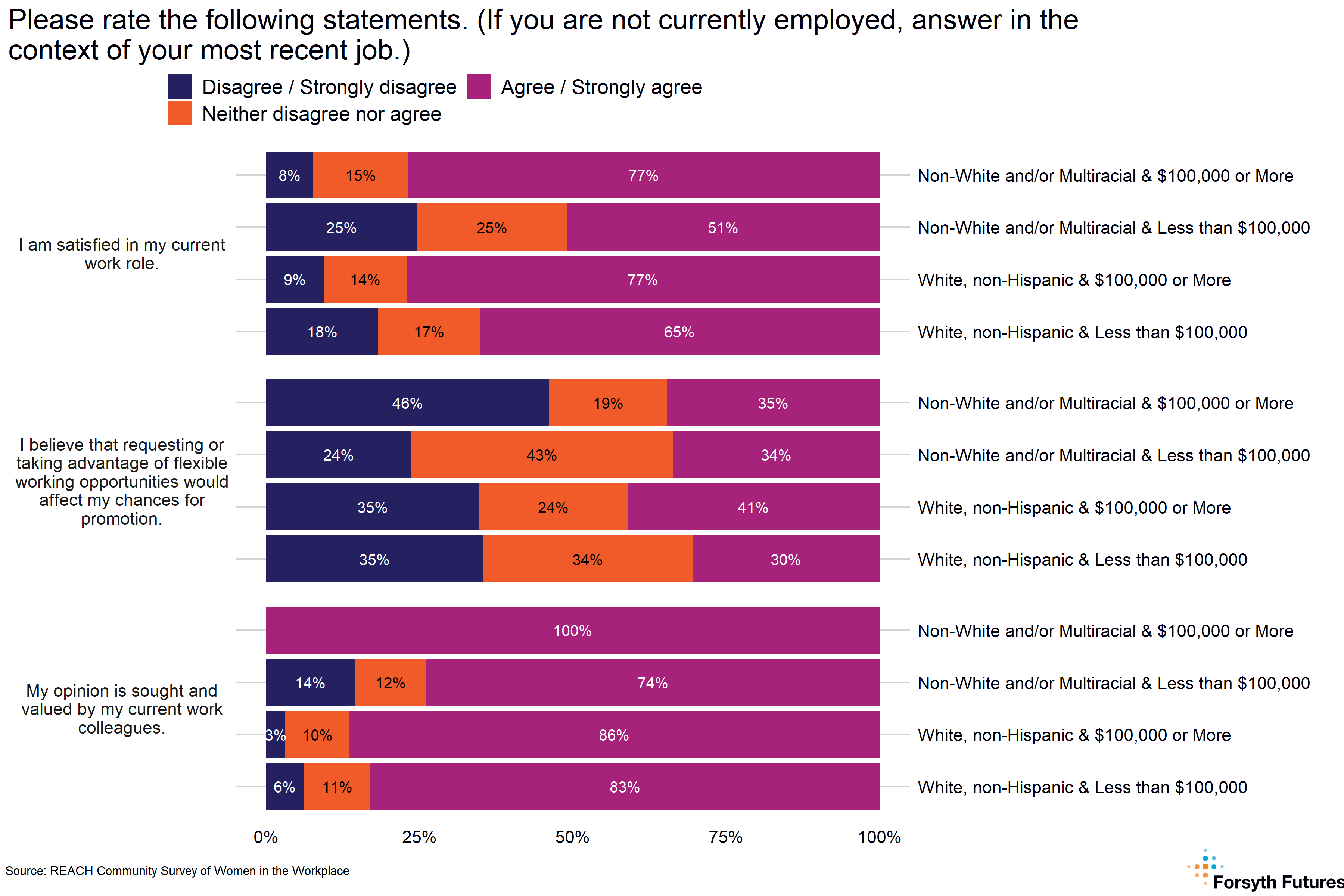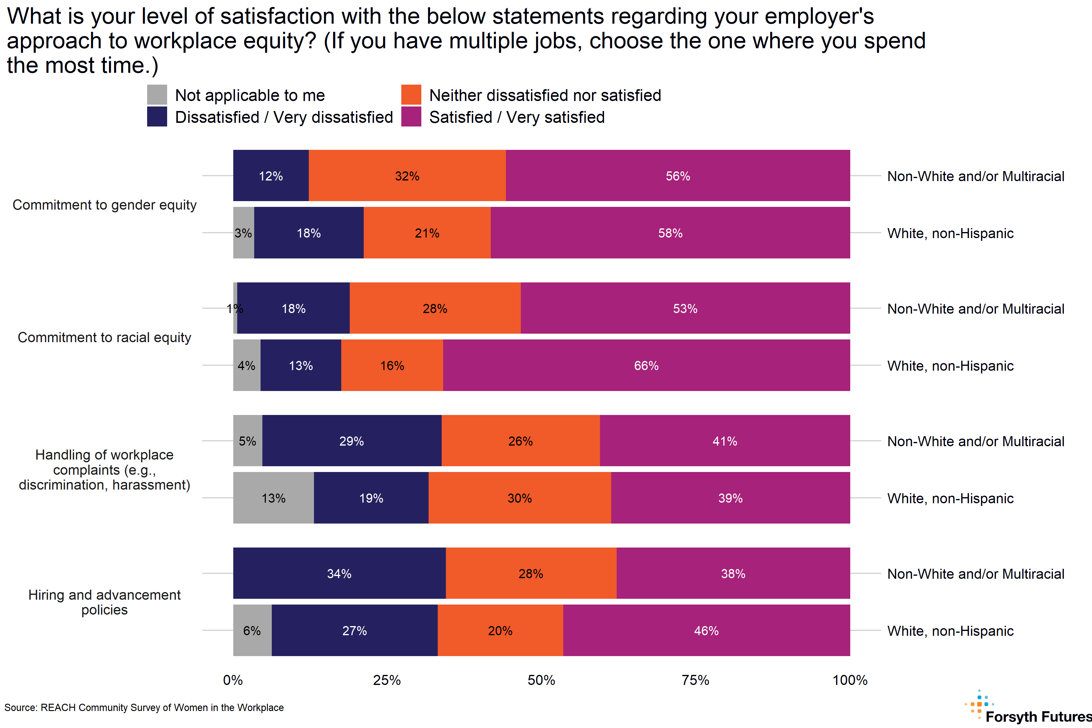 Among the disaggregations, analysts found the following statistically significant relationships between the level of satisfaction with the statements regarding one’s employer’s approach to workplace equity: