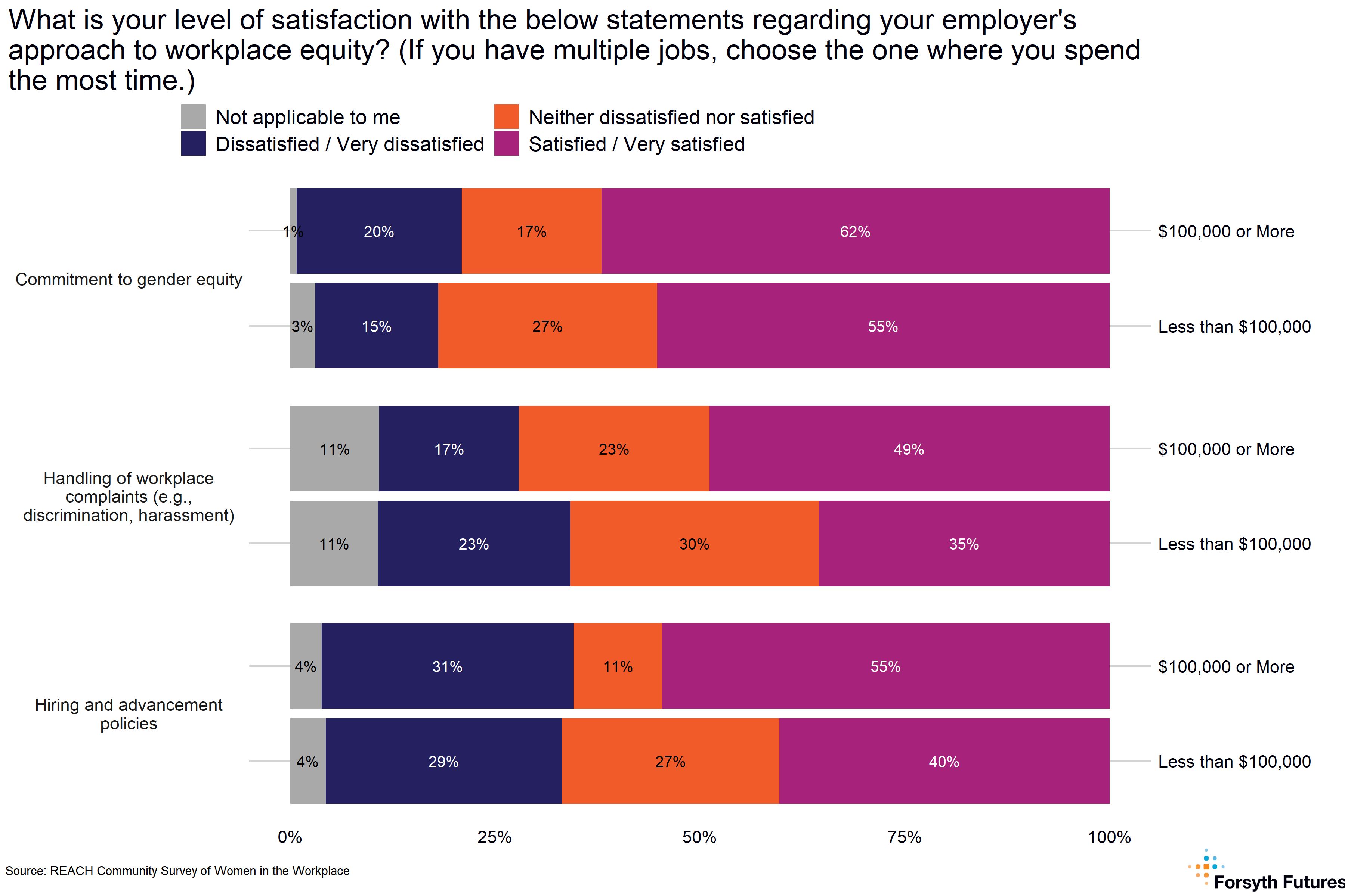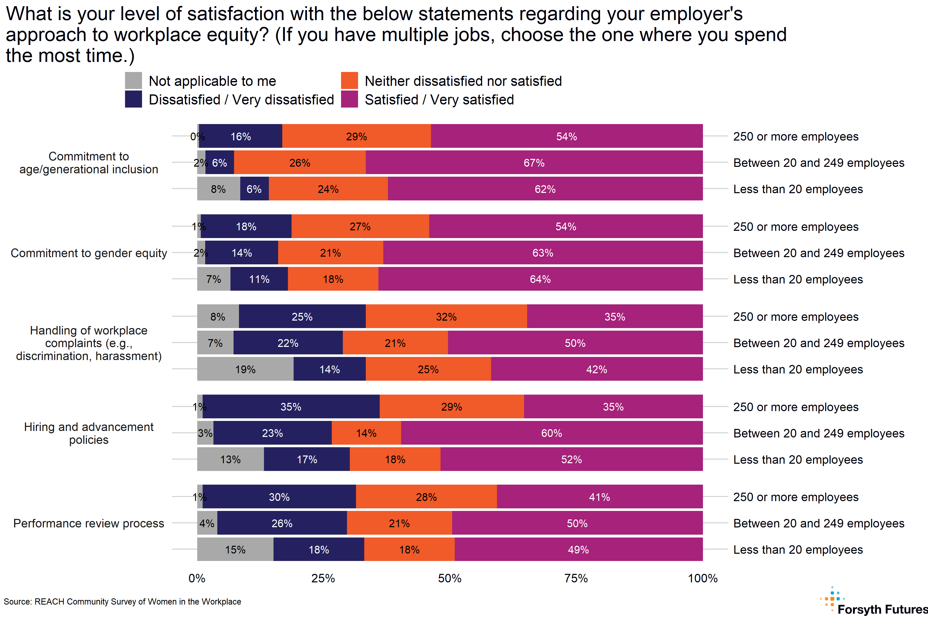 - When rating different aspects of satisfaction with their employers’ commitment to workplace equity, women’s responses varied by all of the disagregations examined except age / generation for commitment to gender equity, handling of workplace complaints, and hiring and advancement policies.