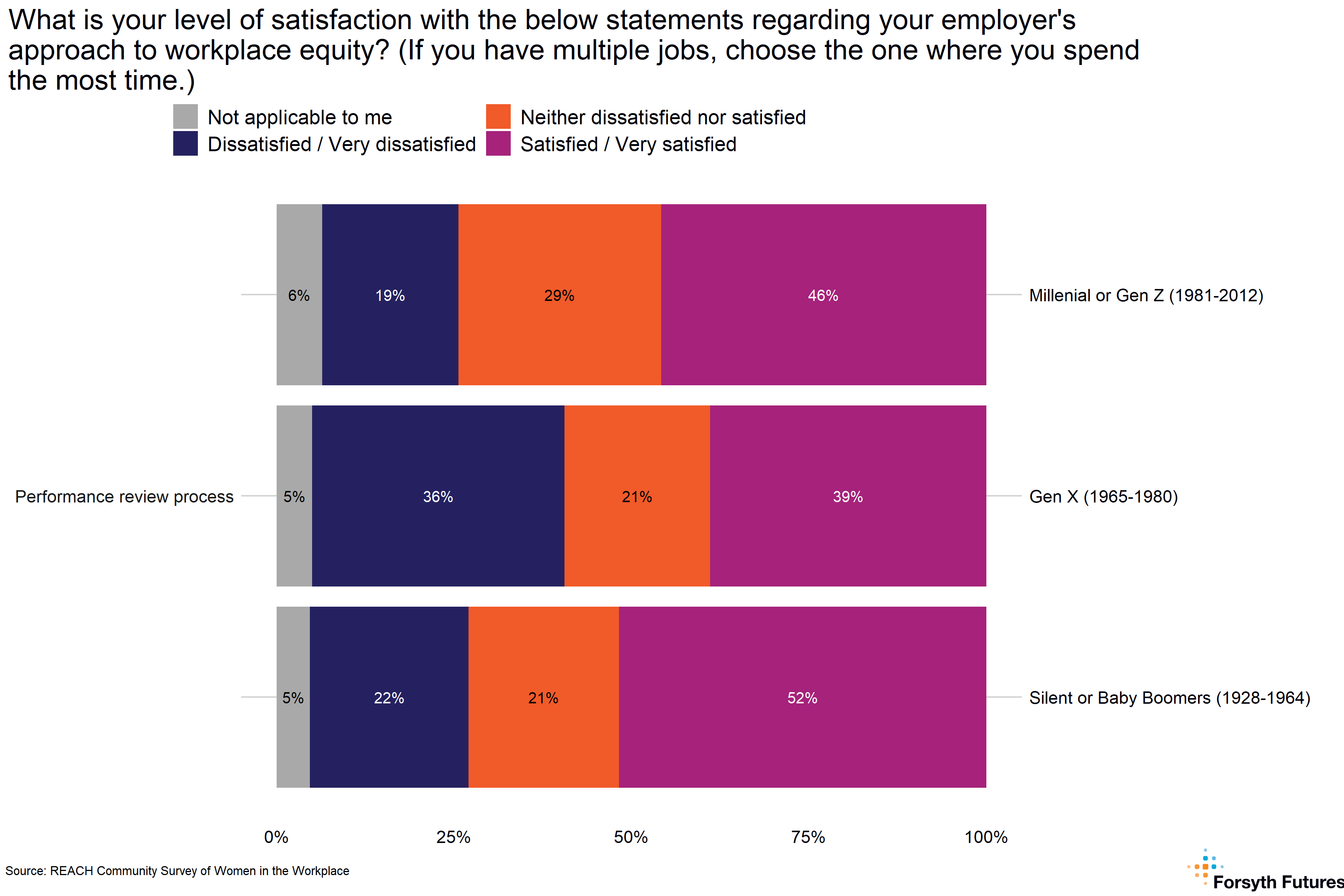 - When rating different aspects of satisfaction with their employers’ commitment to workplace equity, women’s responses varied by all the disaggregations examined except age / generation for commitment to gender equity, handling of workplace complaints, and hiring and advancement policies.