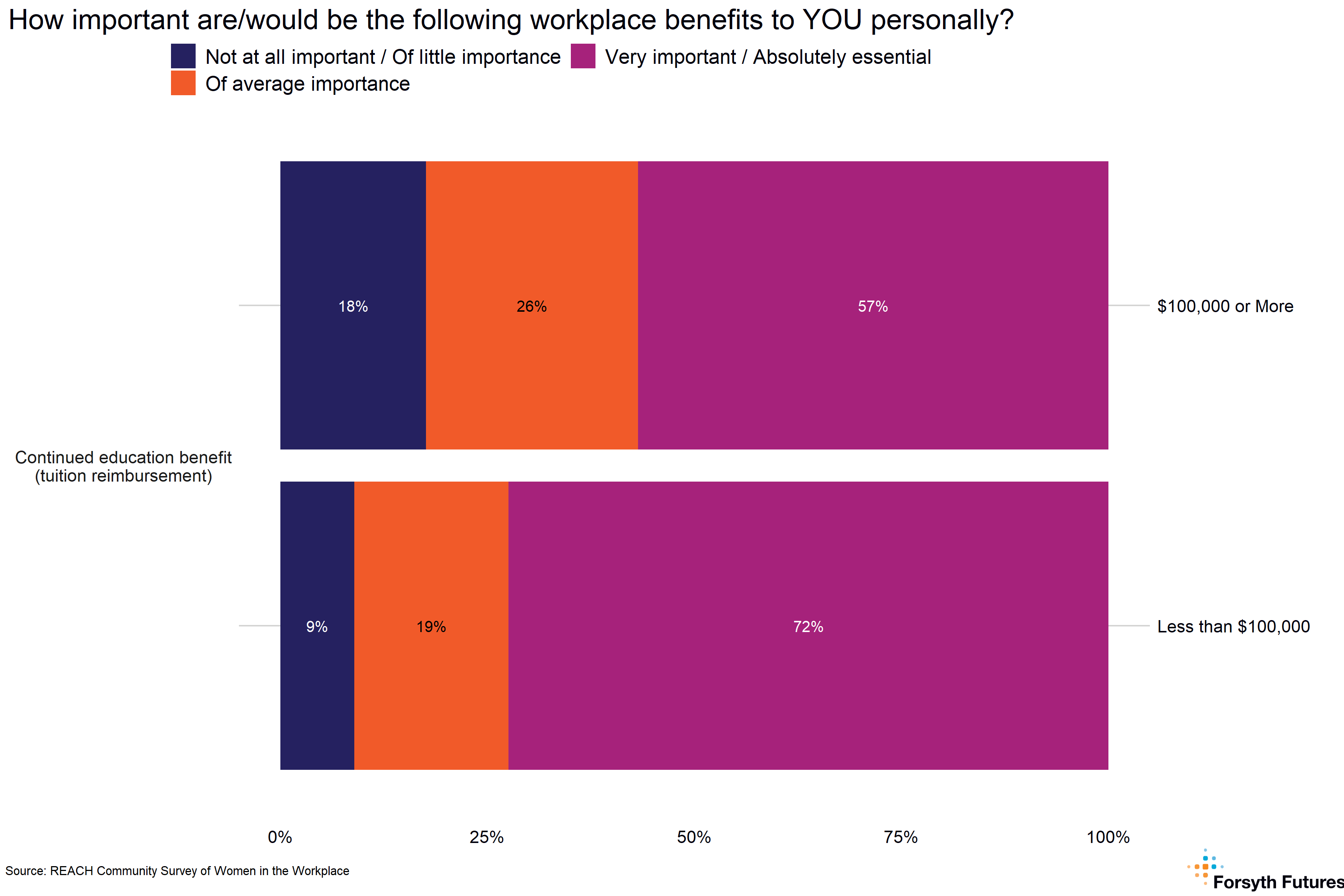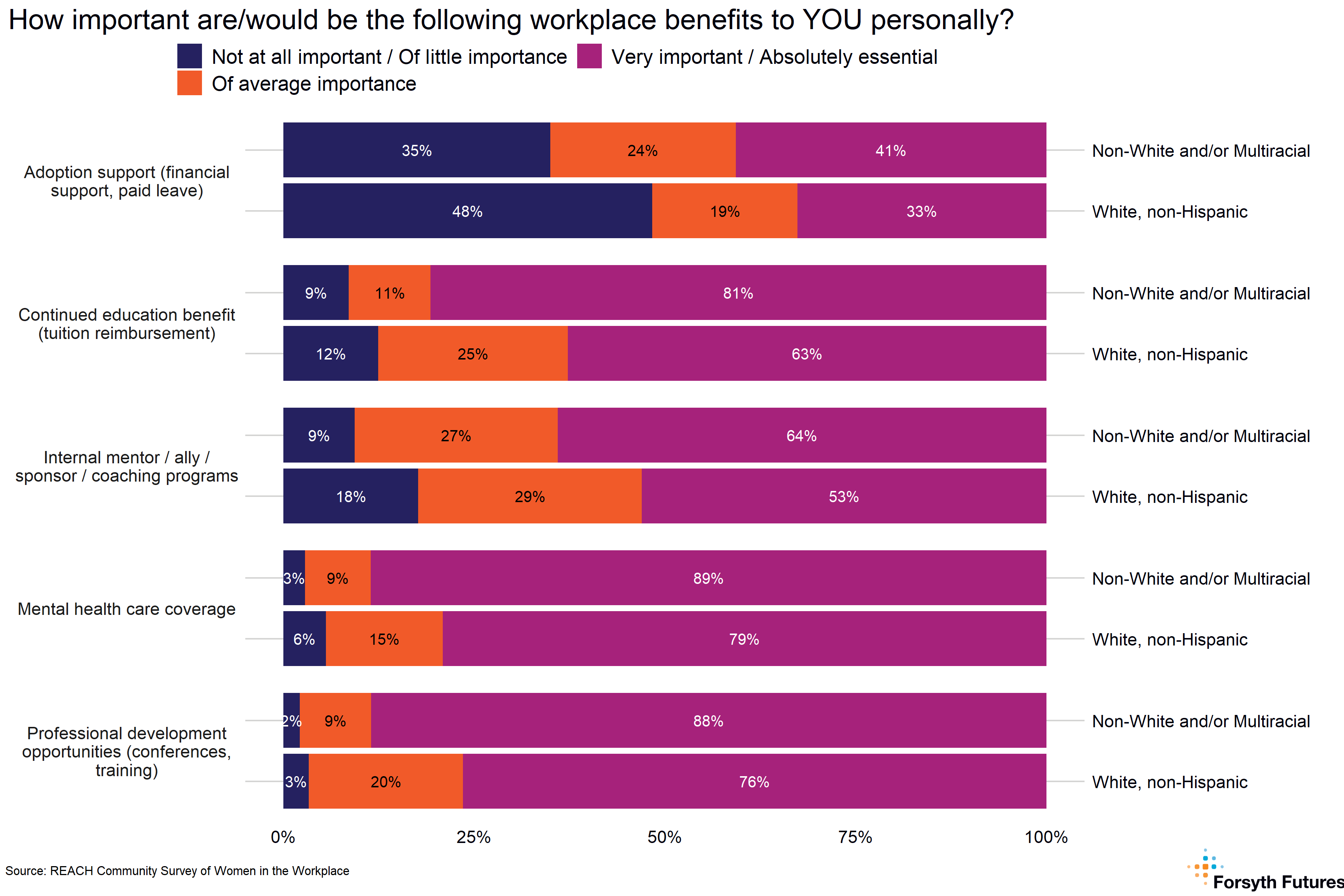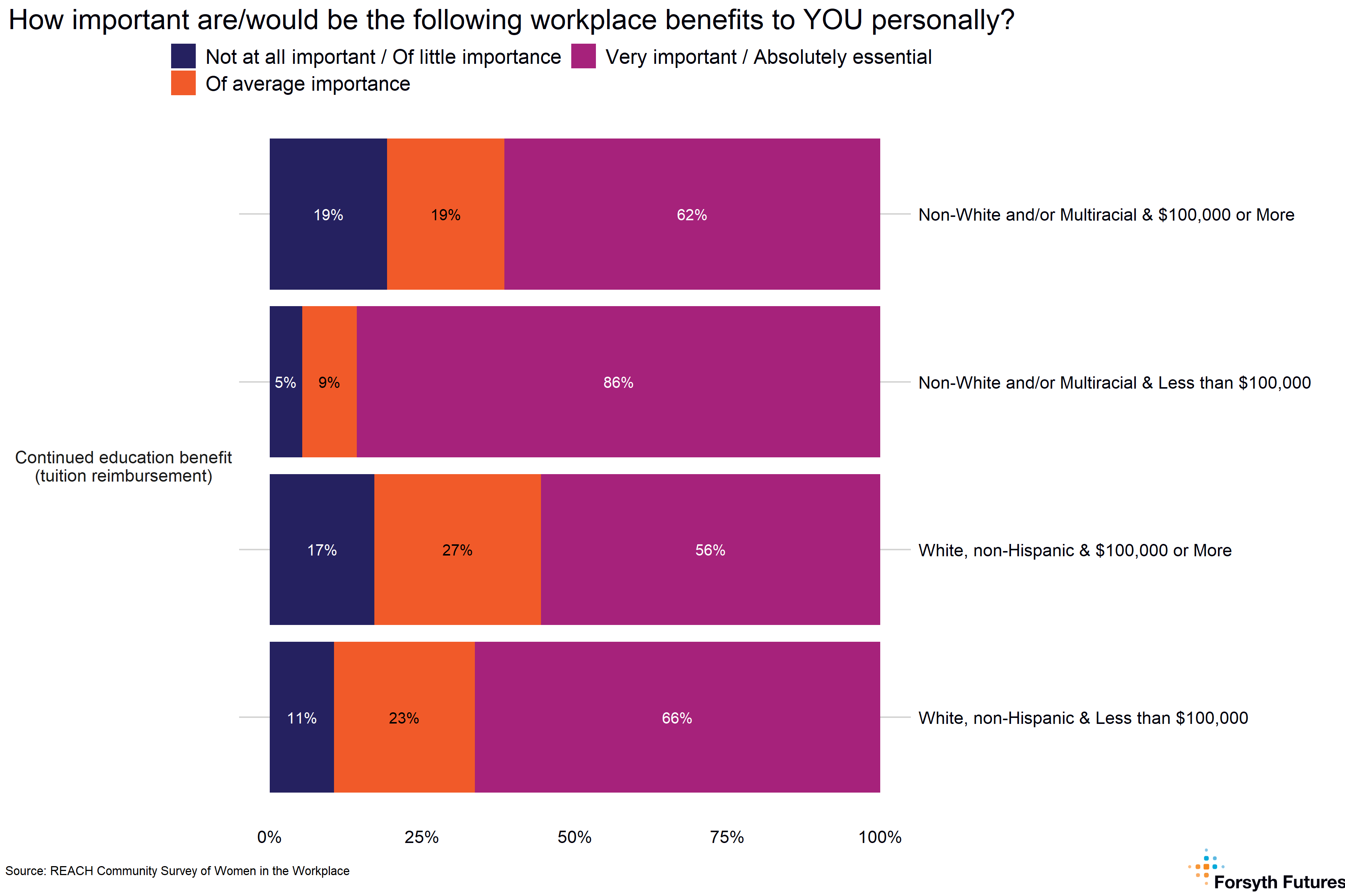 - Out of all the benefits assessed, women from different backgrounds reported the most consistent variation in satisfaction levels across demographic groups with continuing education opportunities.