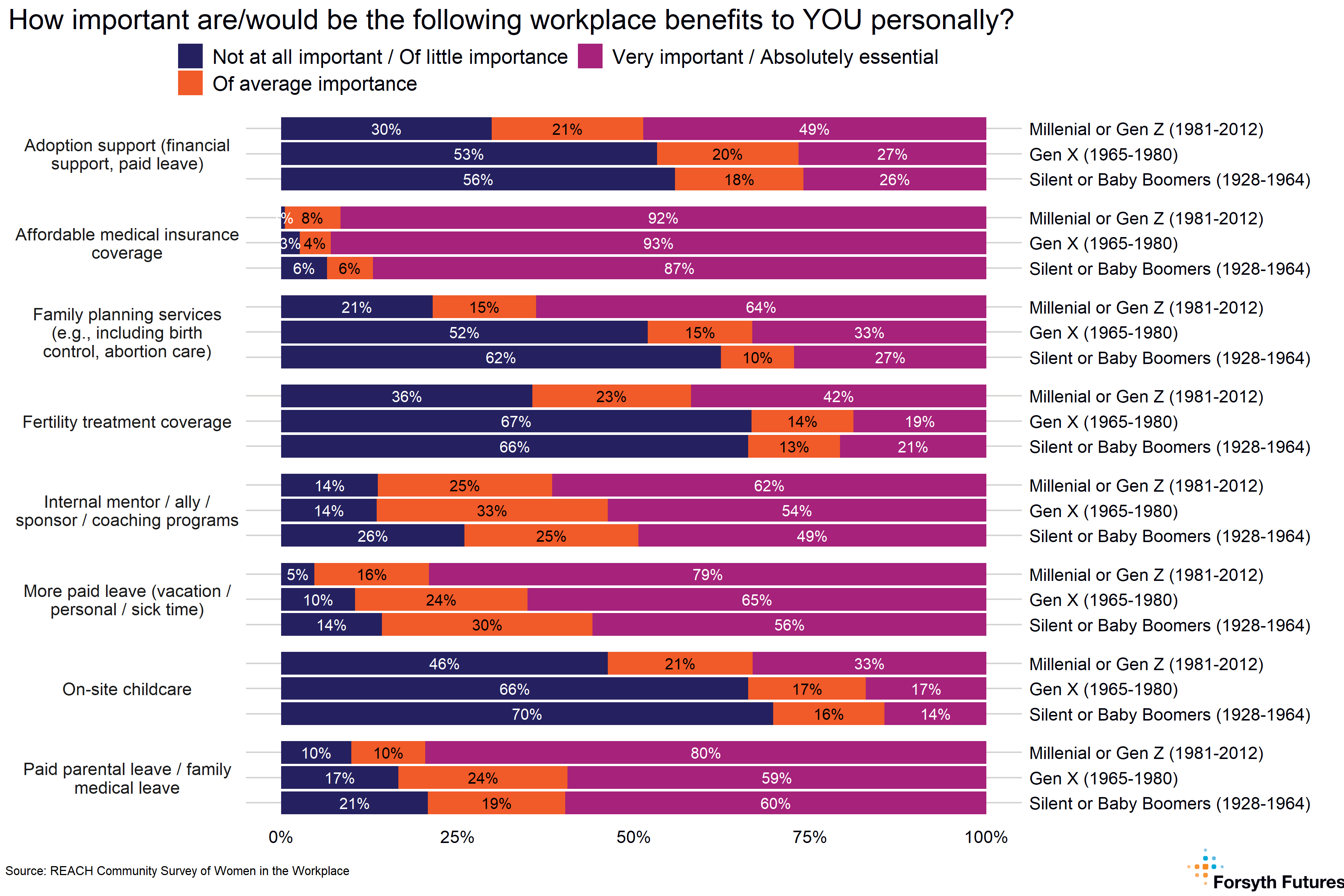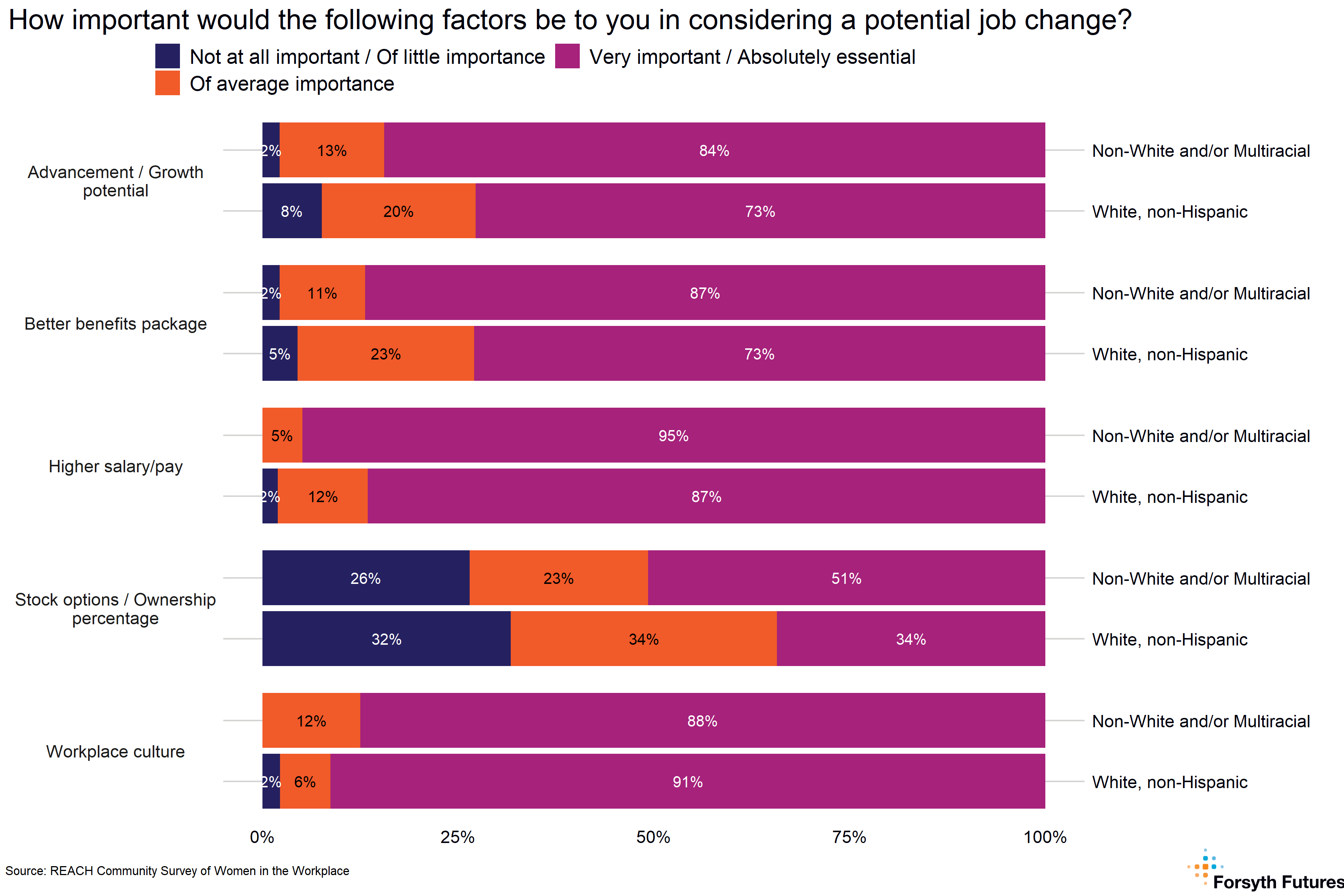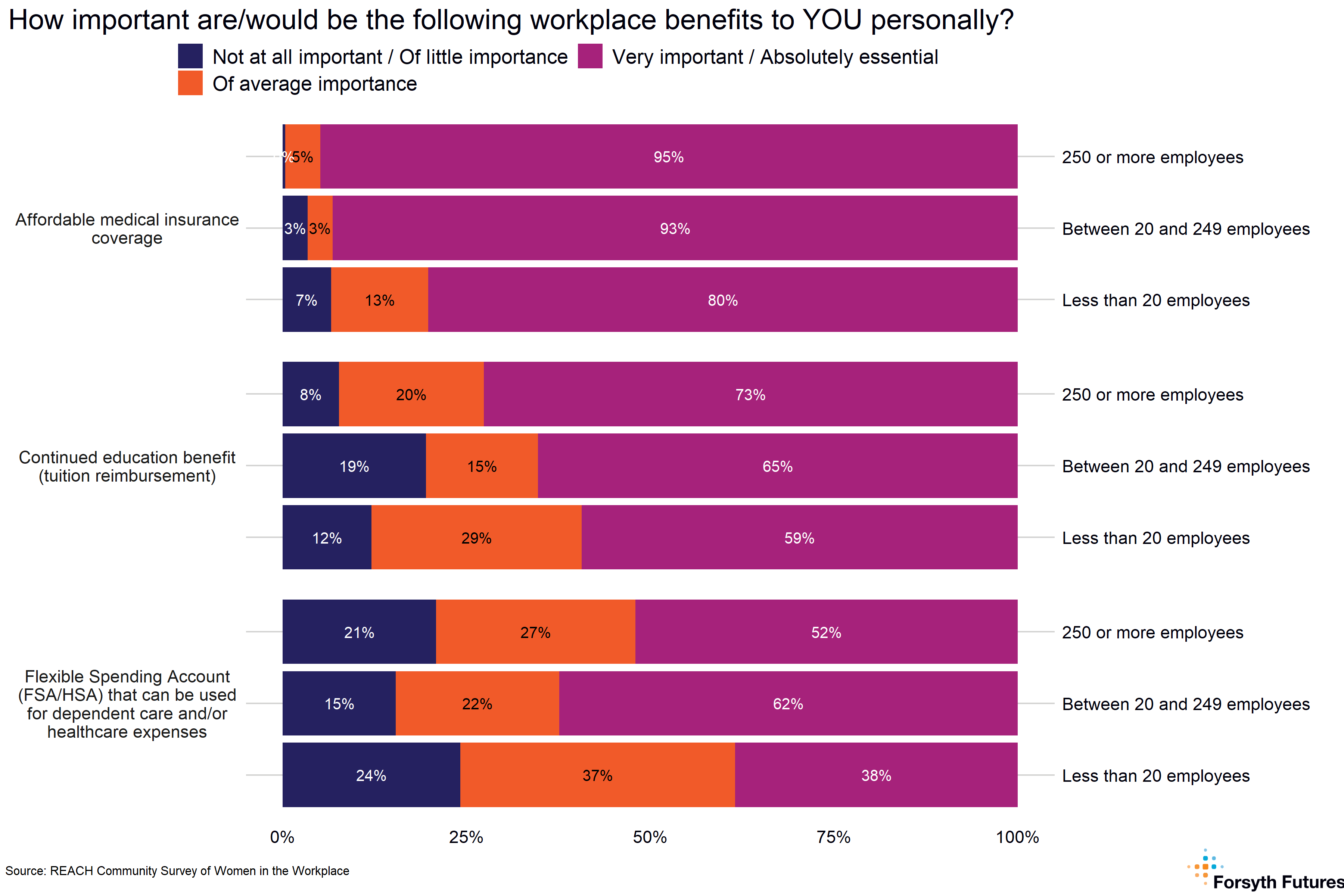 - Out of all the benefits assessed, women from different backgrounds reported the most consistent variation in satisfaction levels across demographic groups with continuing education opportunities.