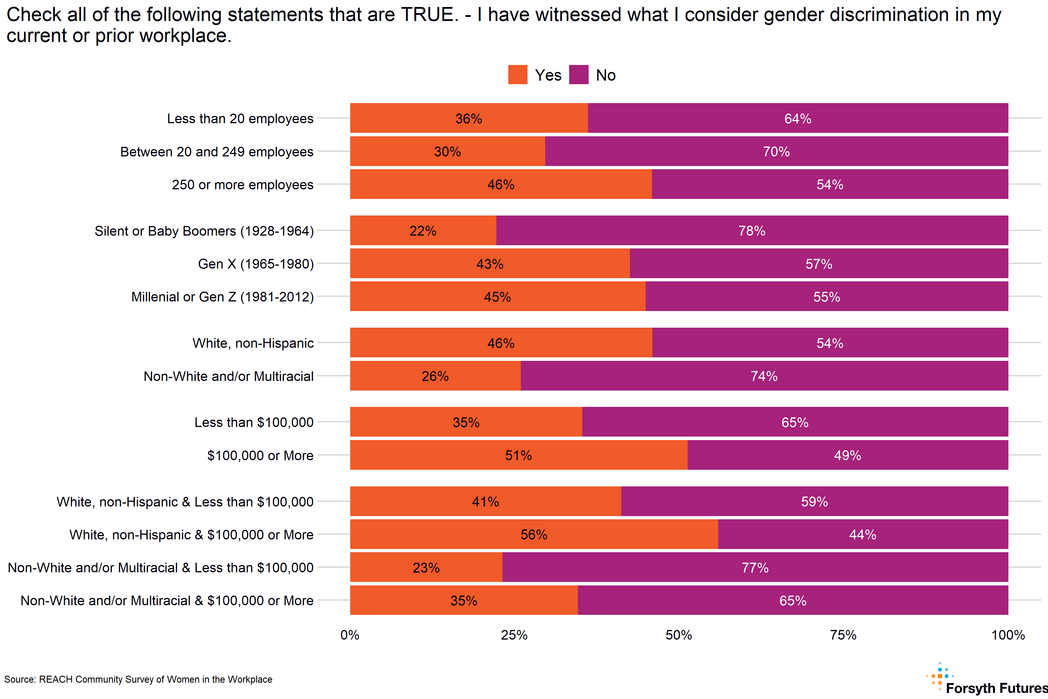 - Gender discrimination showed the highest variation in how various groups of women reported experiencing or witnessing it at work, among all the assessed forms of discrimination.
