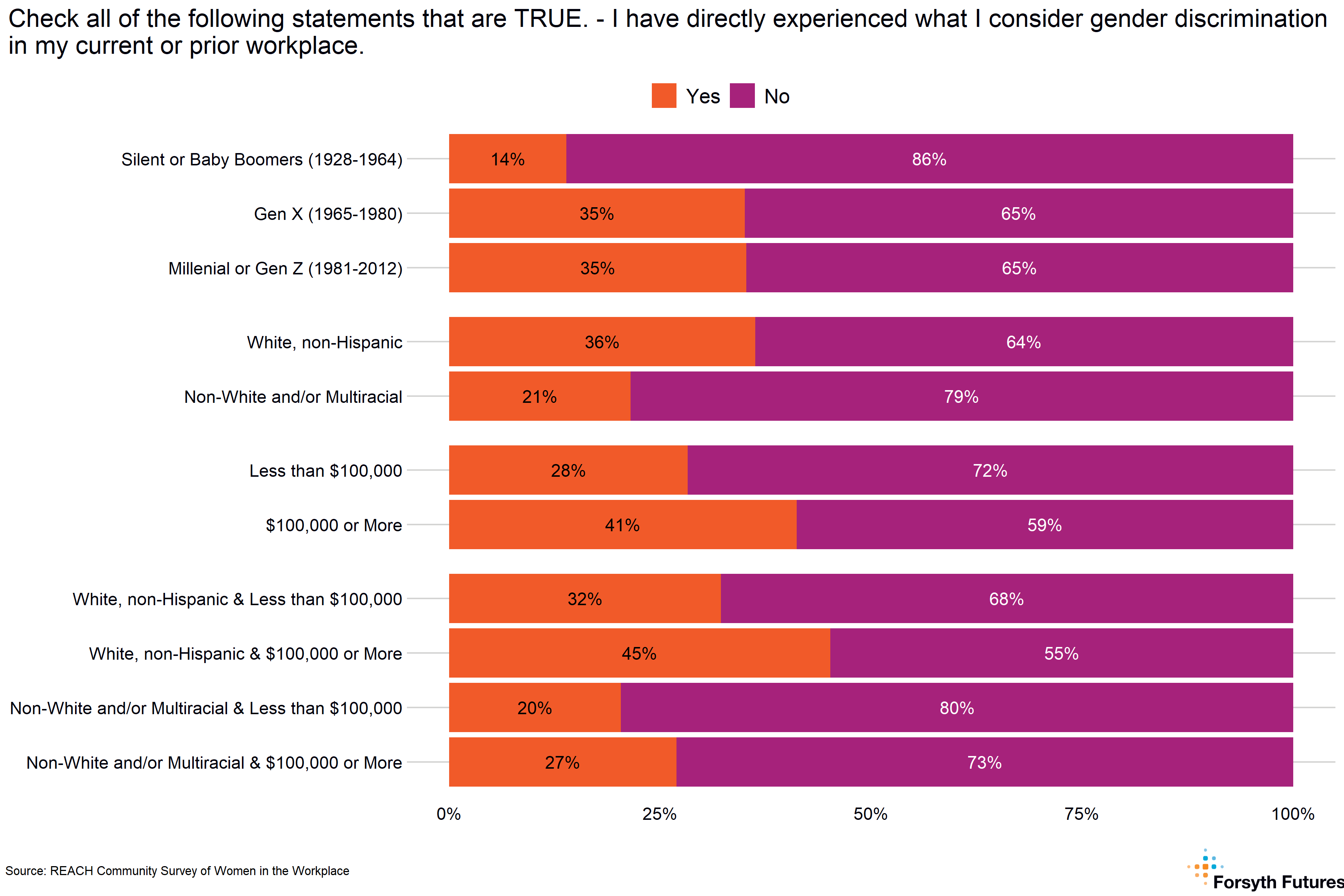 A statistically significant relationship existed between women’s age and directly experiencing gender discrimination or sexual harassment. Additionally, women who reported directly experiencing gender discrimination varied by race / ethnicity, wage income, and race / ethnicity and wage income together. No statistically significant relationships were found between witnessing or directly experiencing bullying or ageism and the disaggregating groups.