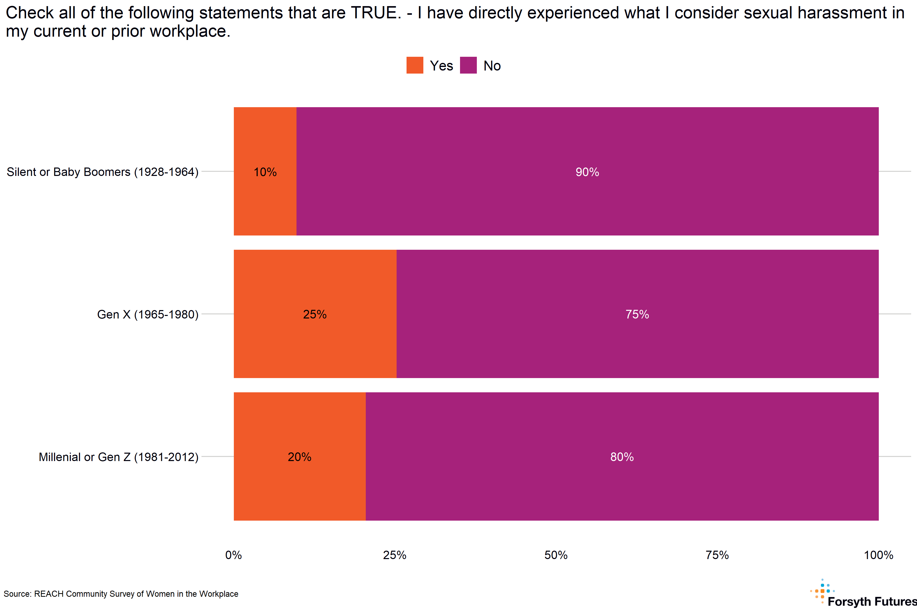 - Analysts found a statistically significant relationship between women’s age and experiencing sexual harassment at work.