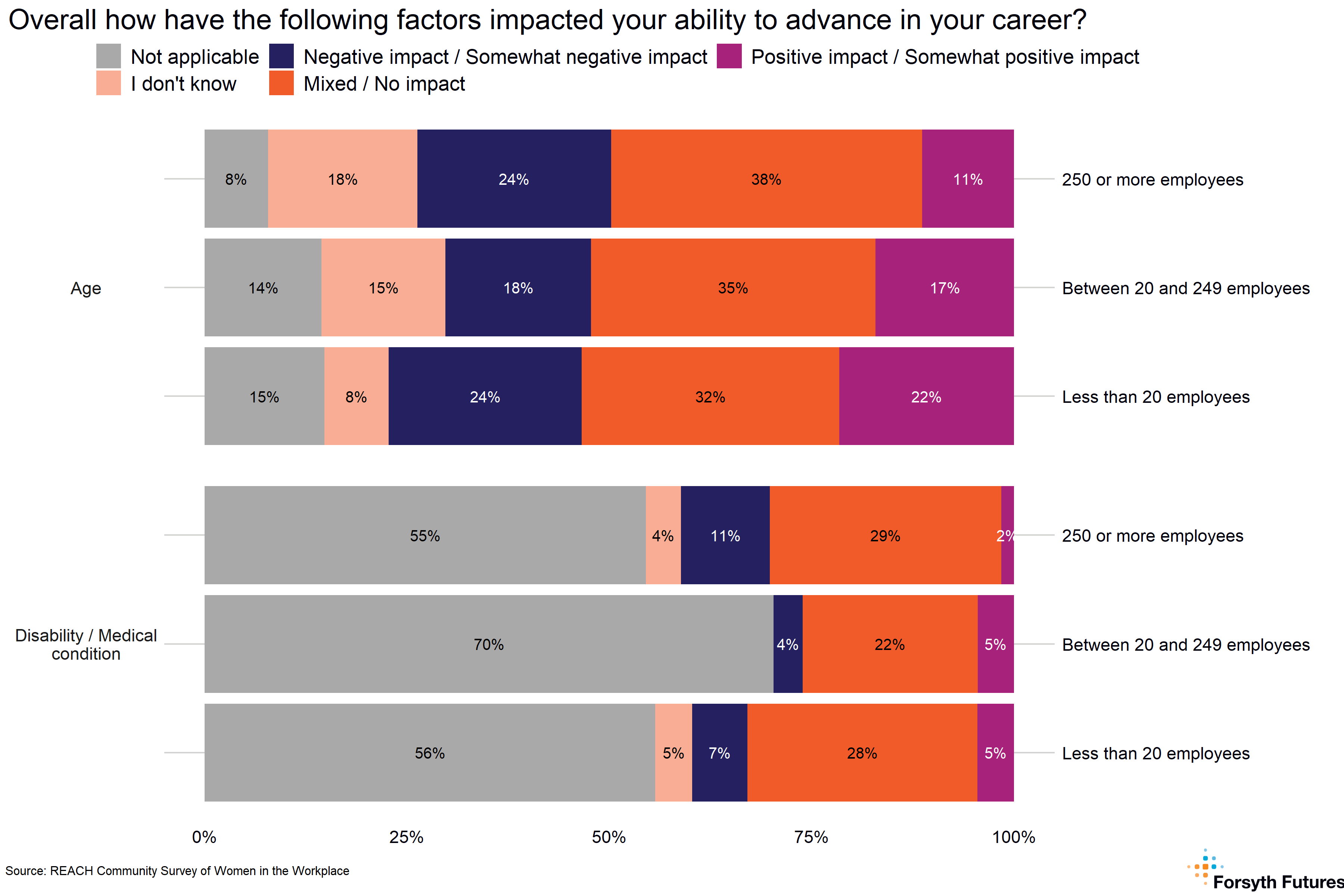 - Analysts found the most consistent variation across demographic groups in how age impacted their career advancement.