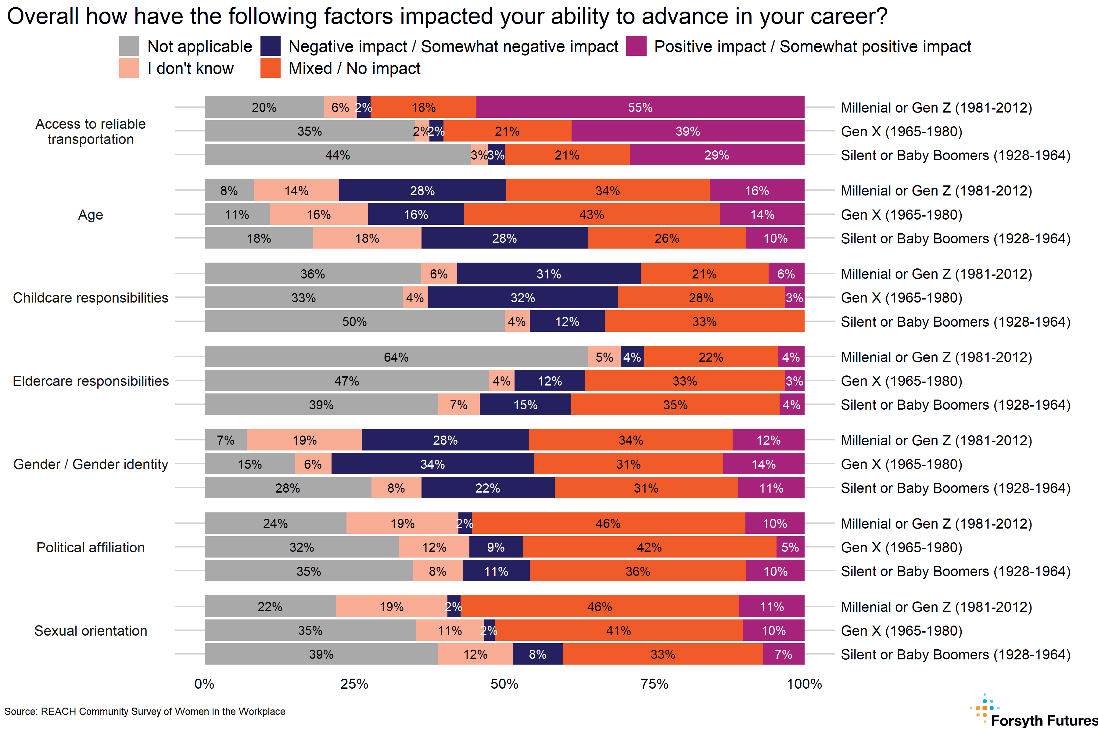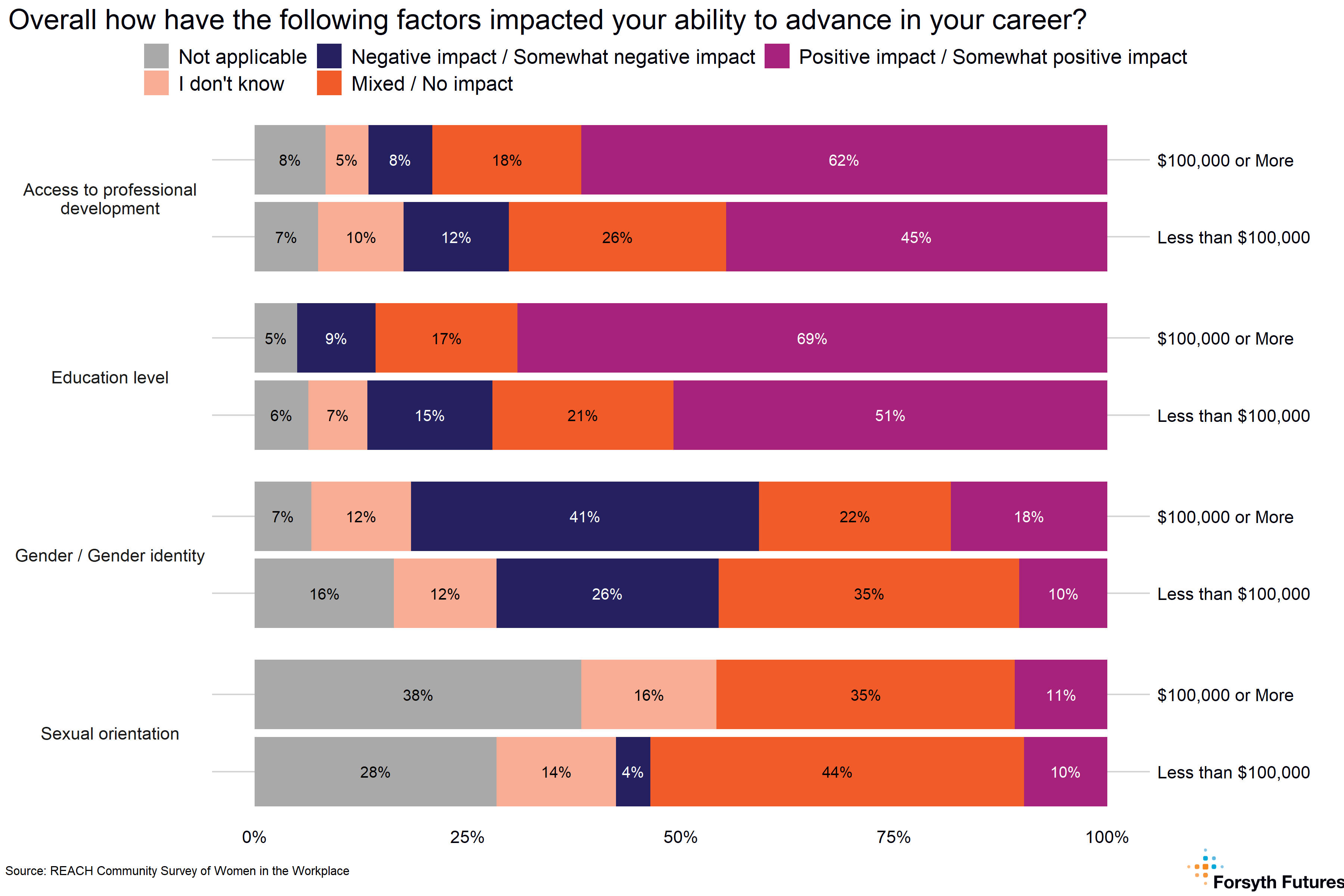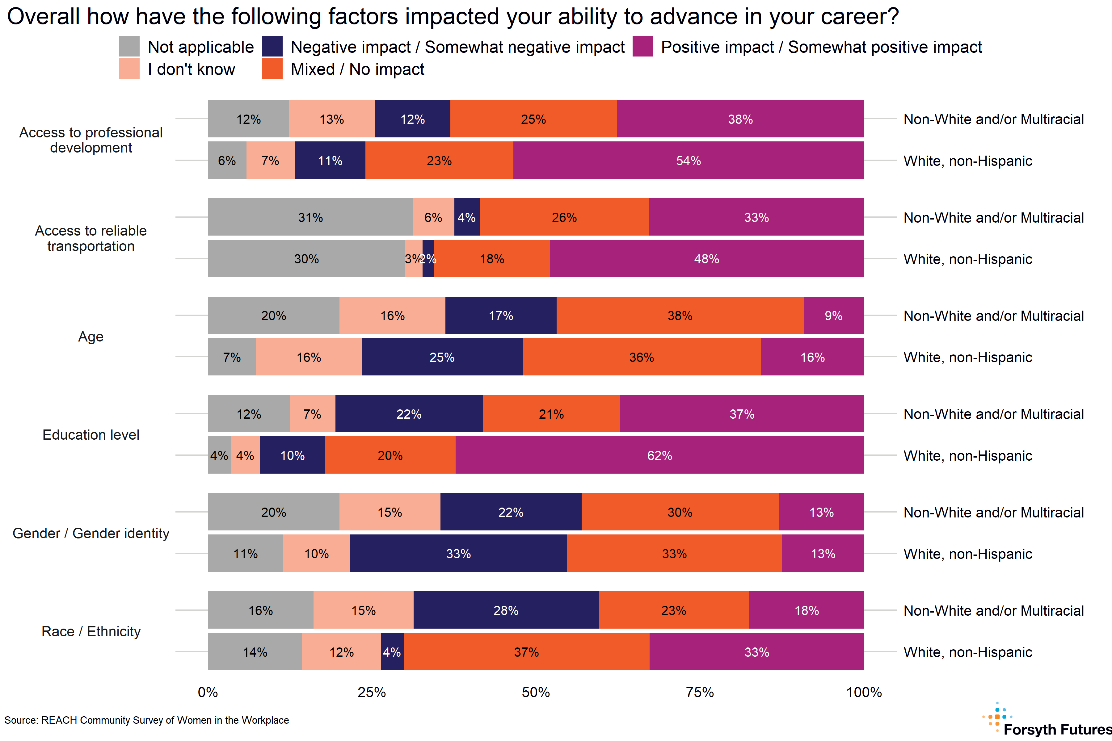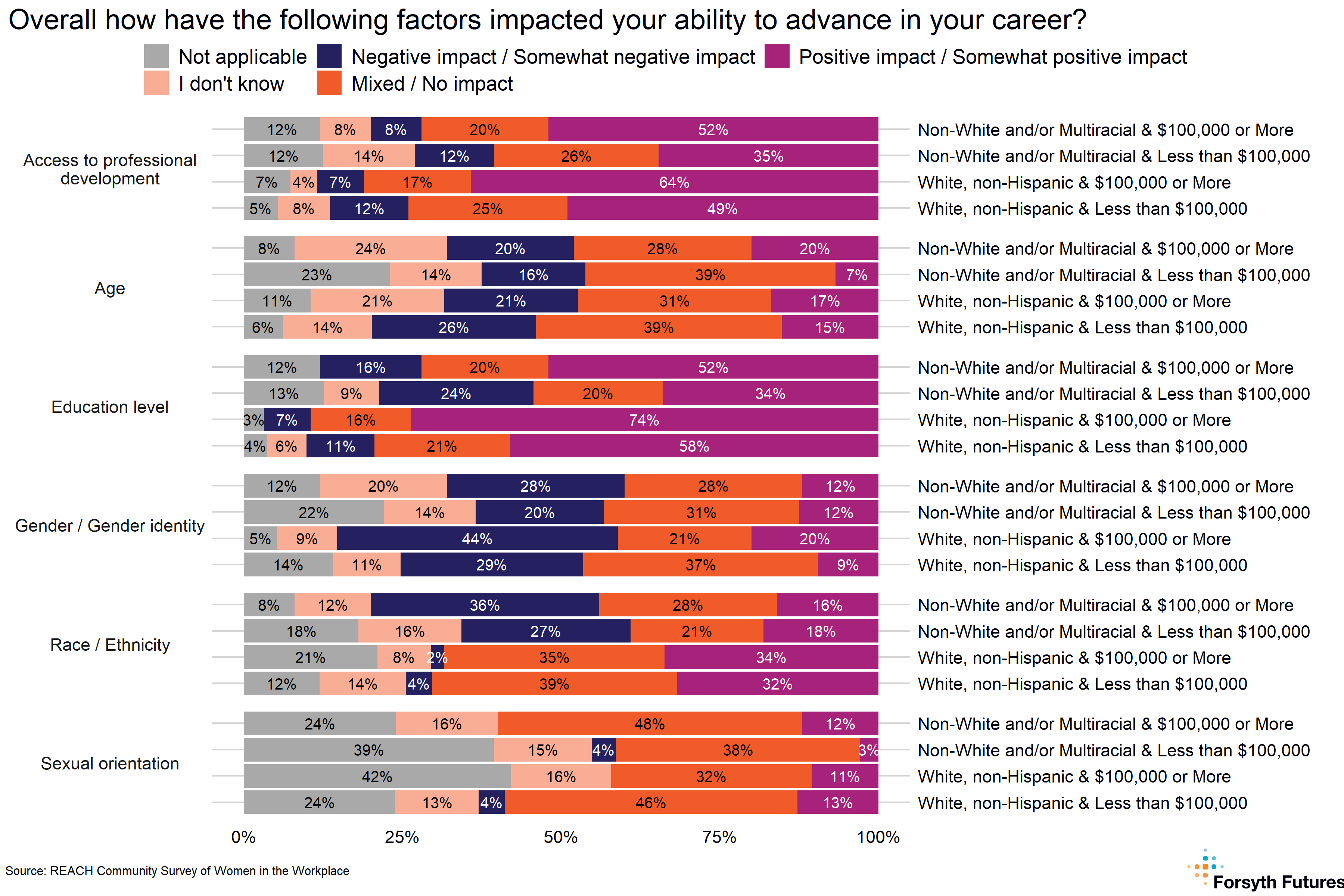 Among the disaggregations, analysts found the following statistically significant relationships between the factors that influence career advancement: