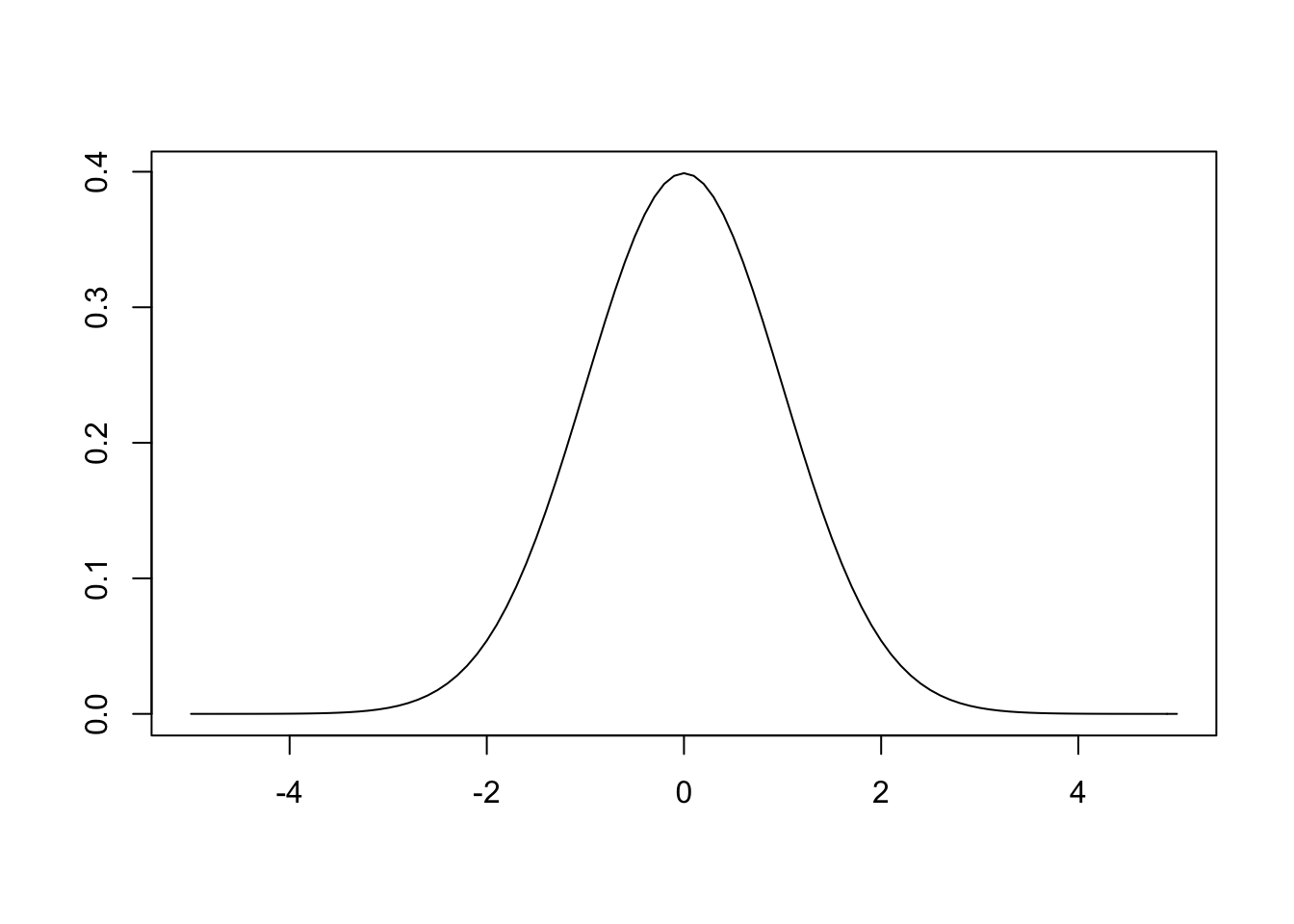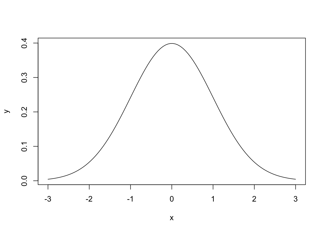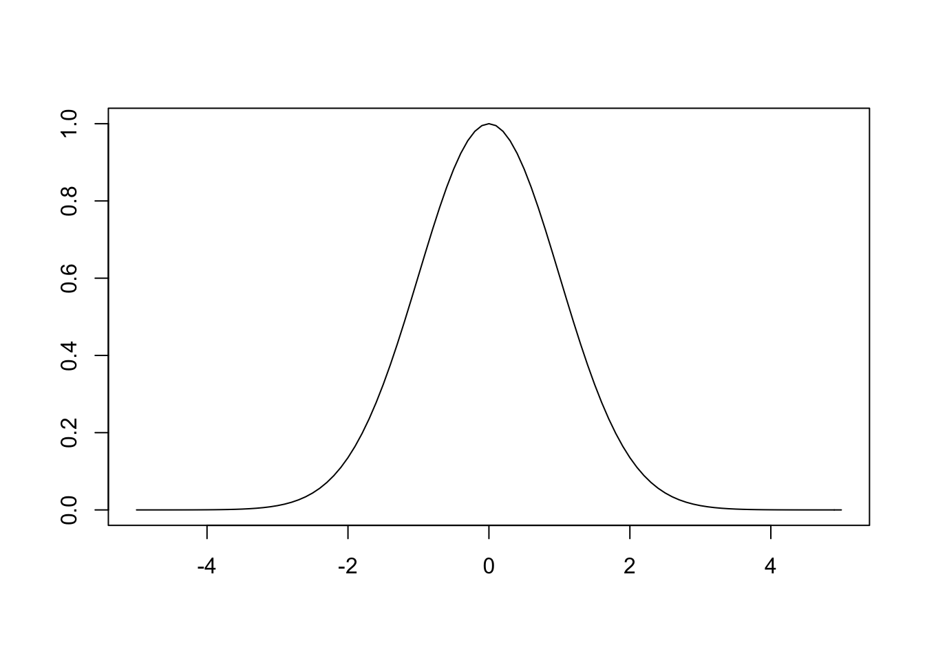 Taking the exponential of a negative parabola is what gives us the bell curve. However, there is still the issue that the area under the curve must be equal to 1 as the probability of all possible events must be equal to 1. As is, the area under the curve is \(2\pi\), so the constant \(\frac{1}{2\pi}\) is included.3 The \(e\) comes out of the derivation, but it is not critical, the math just works out more cleanly when \(e\) is used. The final thing to explain is the \(\frac{1}{2}\) in the exponent, which simply ensures that the variance is equal to 1. Now we can plot the entire function.