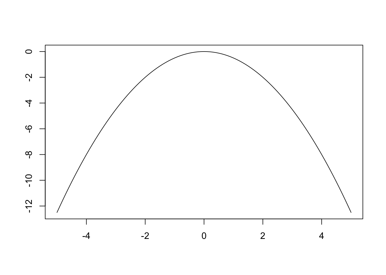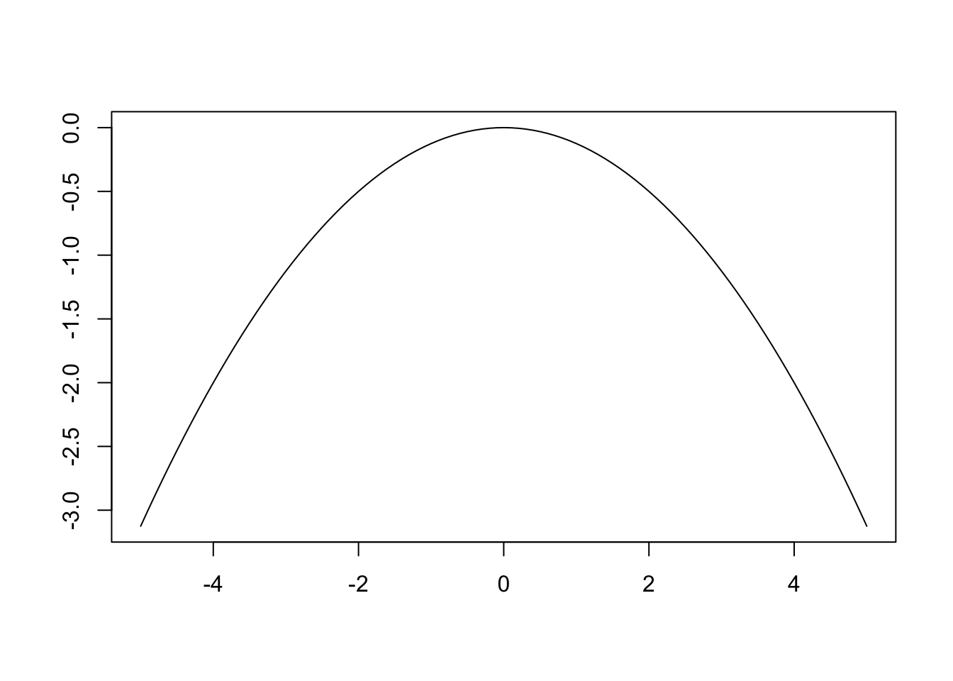 There are plenty of explanations of the derivations of the normal pdf online, but instead let’s play around with the pieces of the formula to try to understand it. Let’s start with the exponent from (1.1) \(e^{-\frac{1}{2}x^2}\) as this is actually the most fundamental part. Here’s a plot of just the exponent \(-\frac{1}{2}x^2\).
