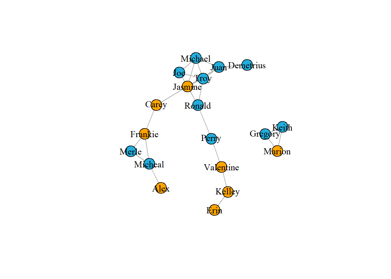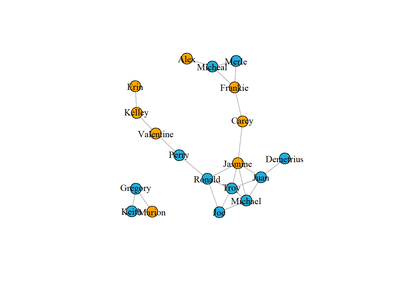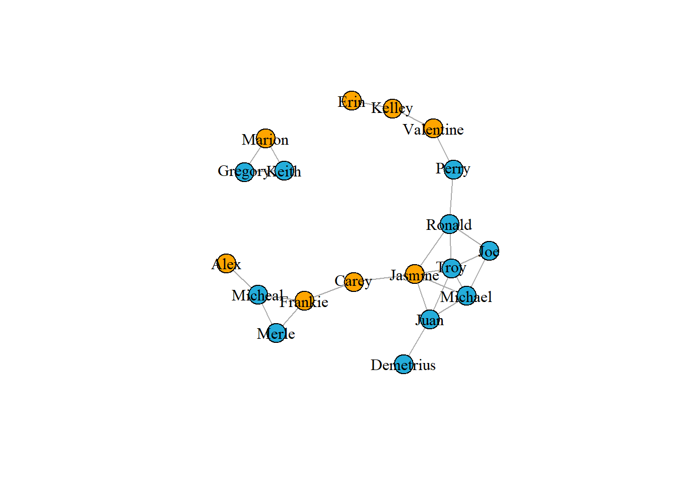 V(g1)$color <- ifelse(V(g1)$gender == "F", "orange", "#24addb")
