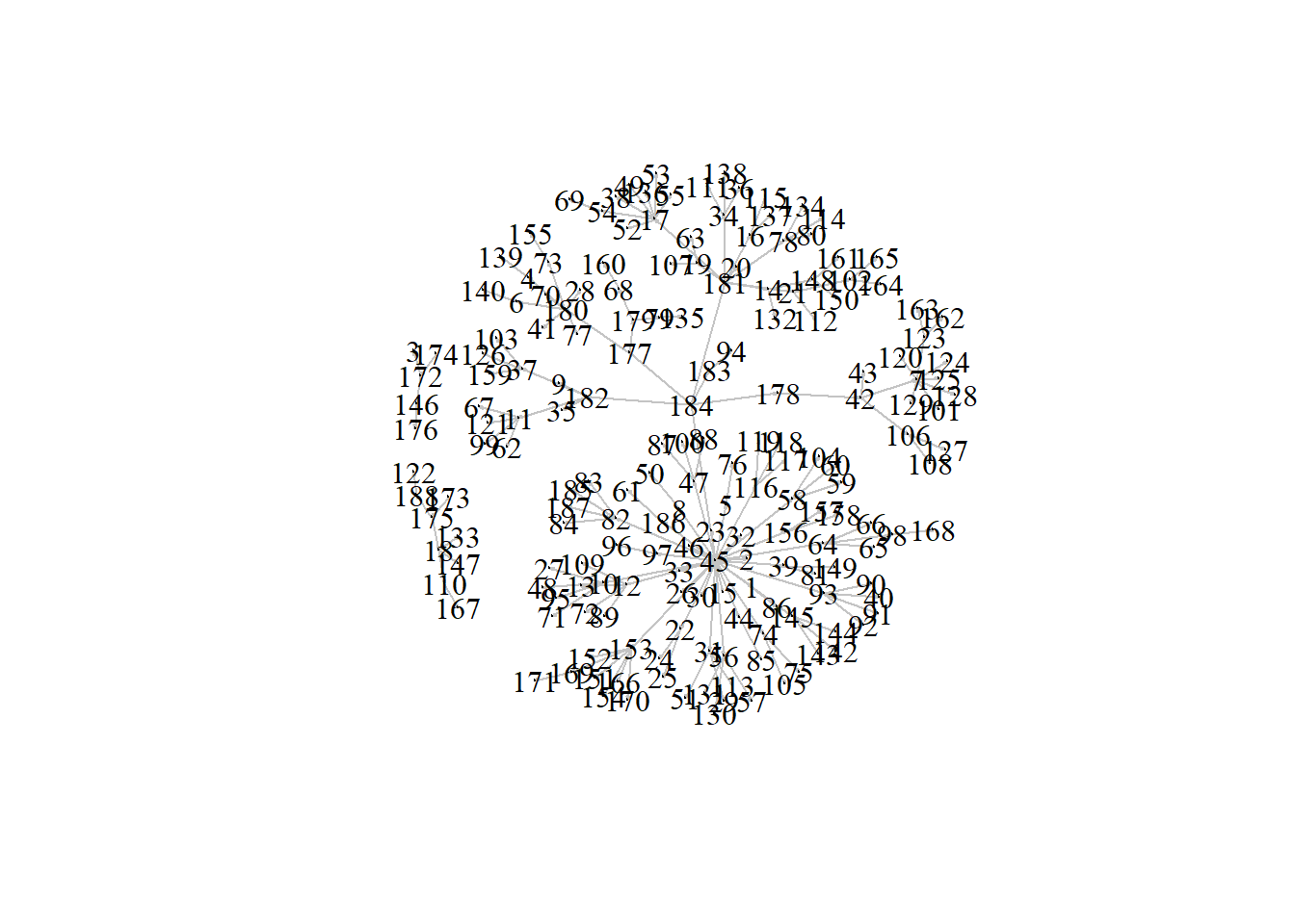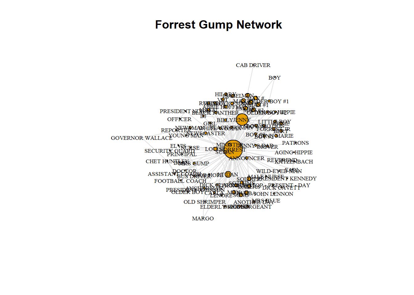 transitivity(): transitivity measures the probability that the adjacent vertices of a vertex are connected. You can use this function to get the global or local transitivity. Also, you can use randomization test to investigate if the global transitivity of the Forrest Gump network is significantly higher.(Conclusion : Yes)Clique : In a clique, every vertex is connected to every other vertex.