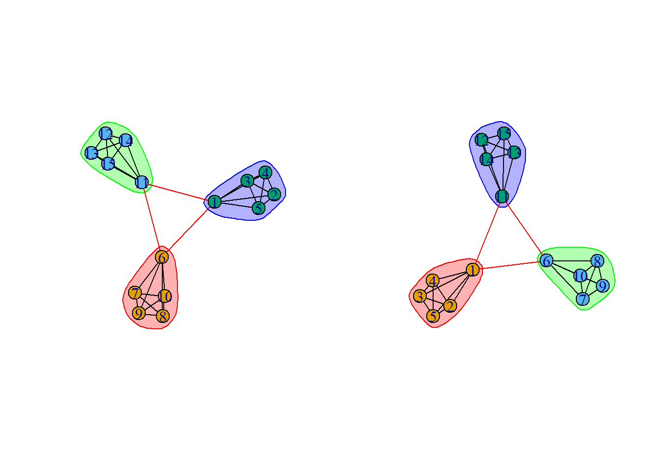 fastgreedy.community(): a community detection method .edge.betweenness.community(): an alternative community detection method.sizes(): determine how many communities were detected and how many club members are in each.membership(): display which club members are in which community.disjoint_union(): the union of two or more graphs are created. The graphs are assumed to have disjoint vertex sets. Notice:x %du% yis a simplified form ofdisjoint_union(...), and this example is from igraph document.- Because the division of this figure is so obvious, there is no difference between the two methods
