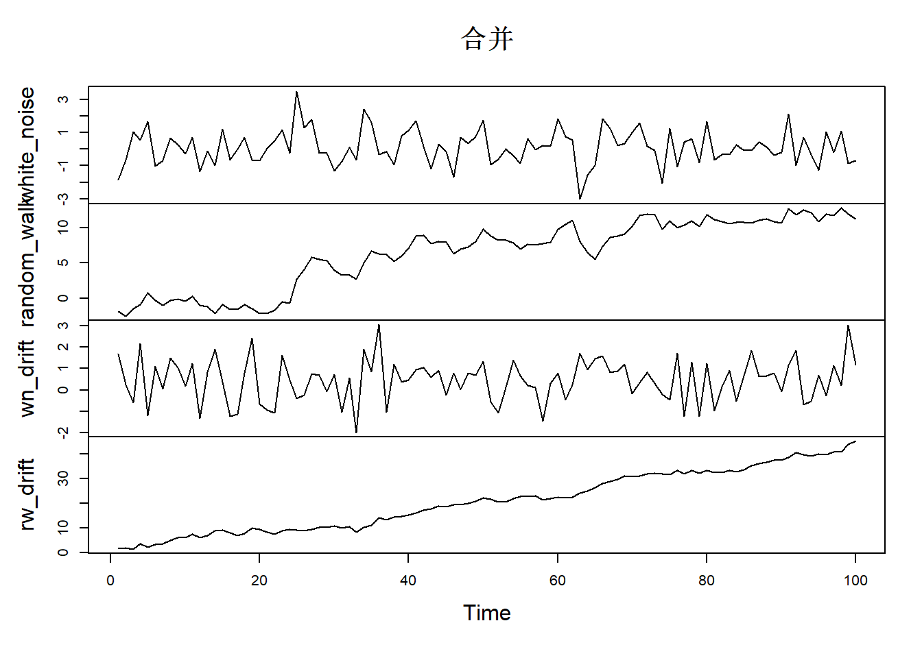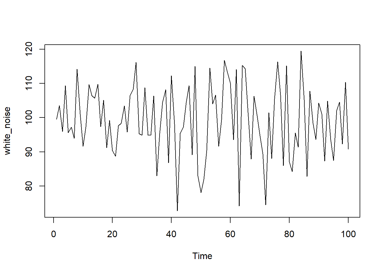 white_noise <- arima.sim(model = list(order = c(0, 0, 0)), n = 100, mean = 100, sd = 10)