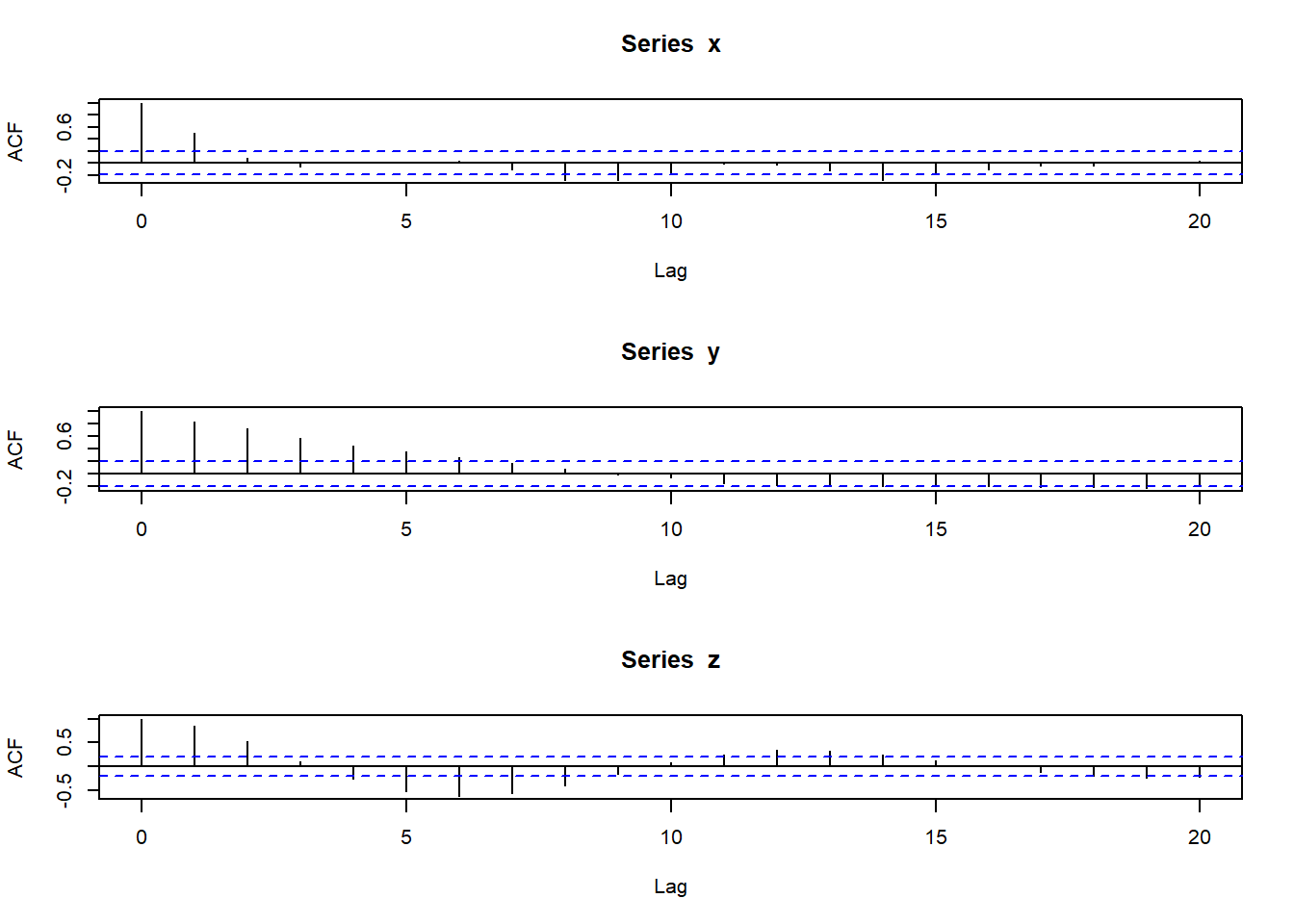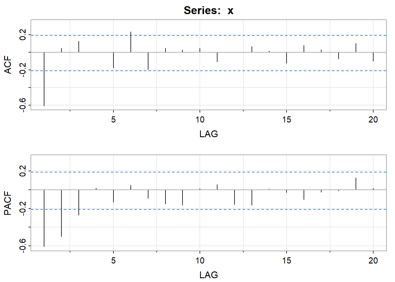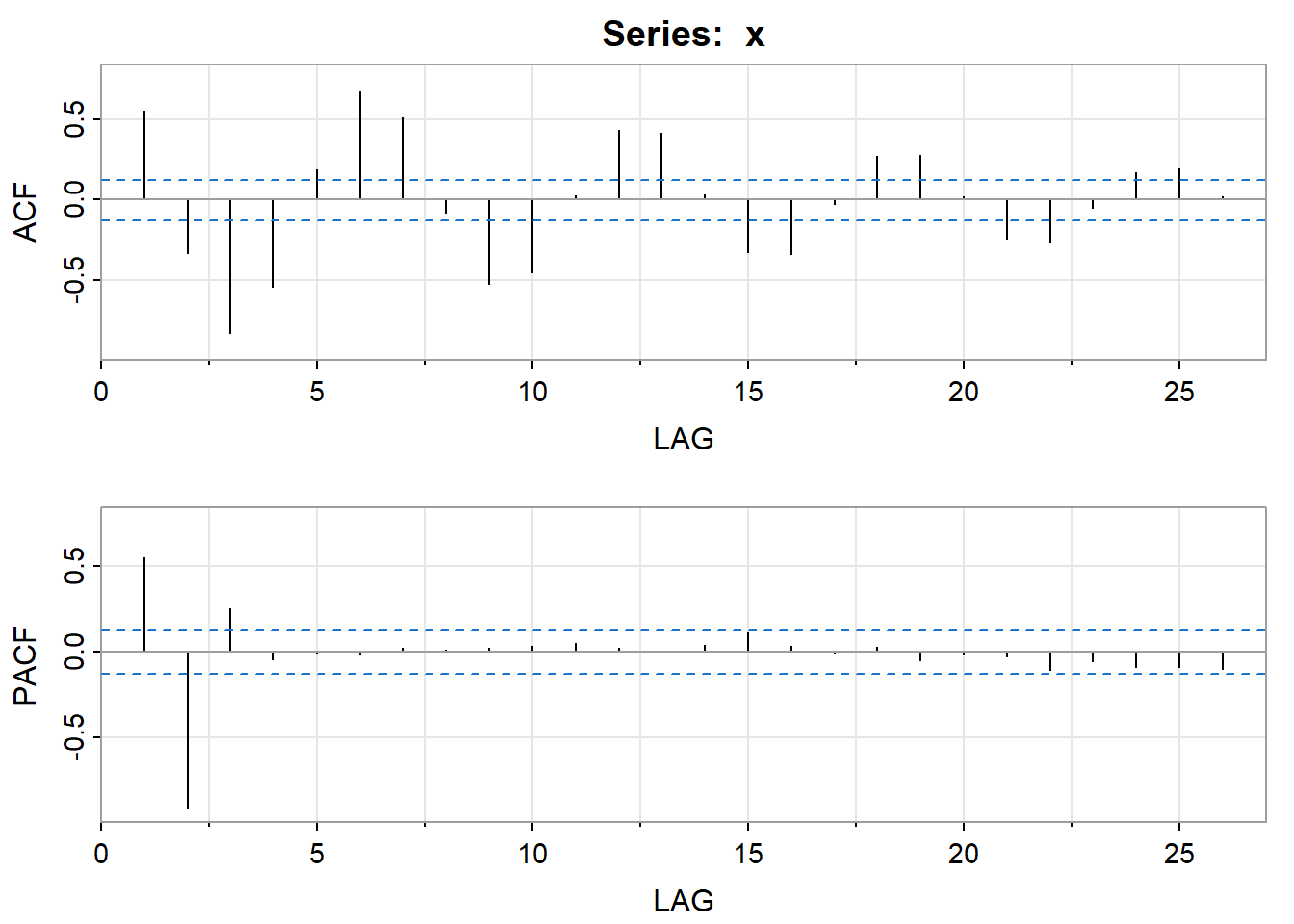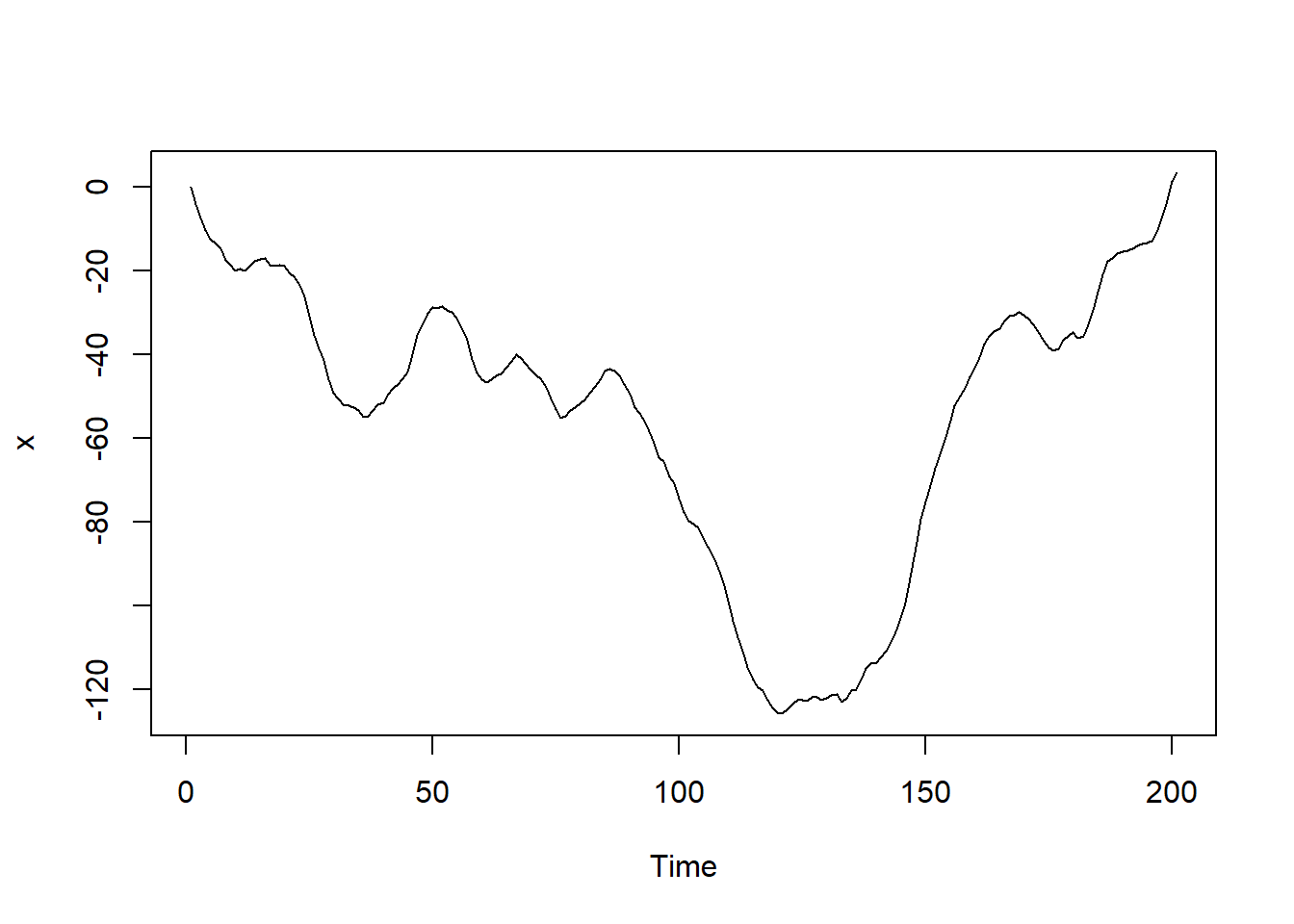 我们可以生成下面的数据 > 例子来自P146 Time Series Analysis and Its Applications With R by Robert H.Shumway and David S.Stoffer