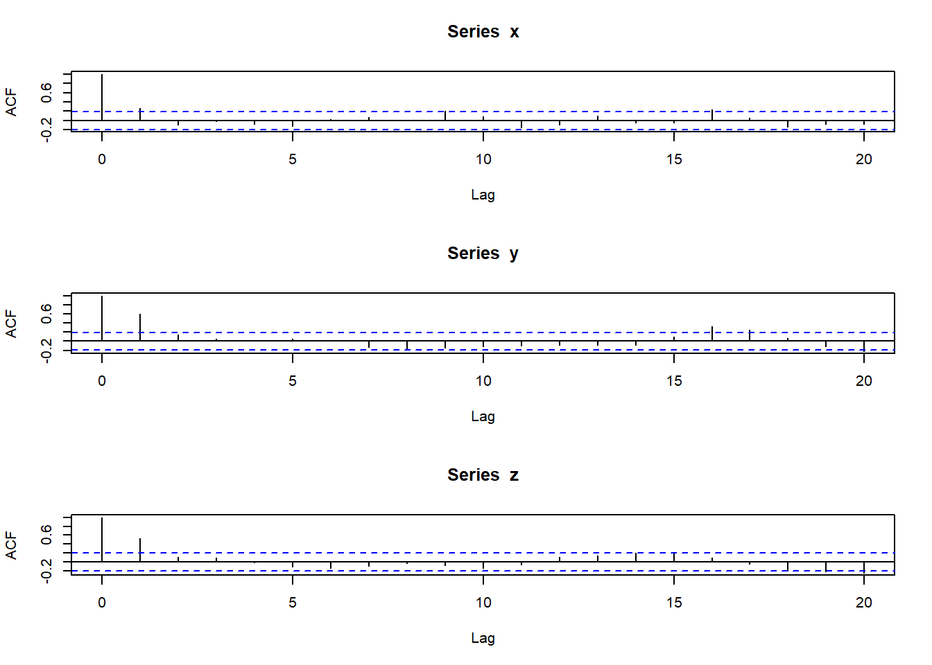 plot(ACF,type="h", xlab="LAG", ylim=c(-.1,1)); abline(h=0)