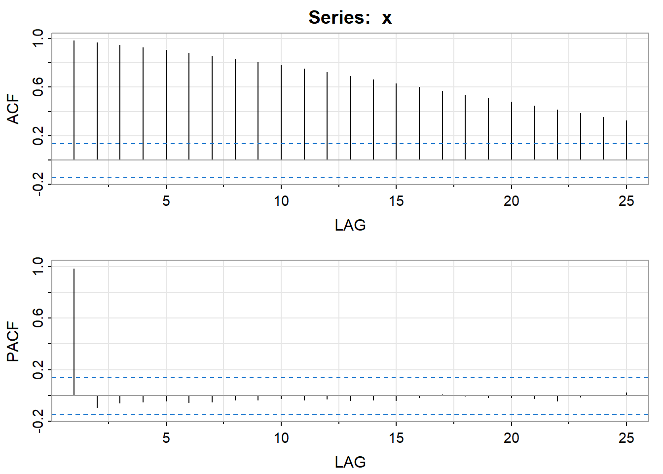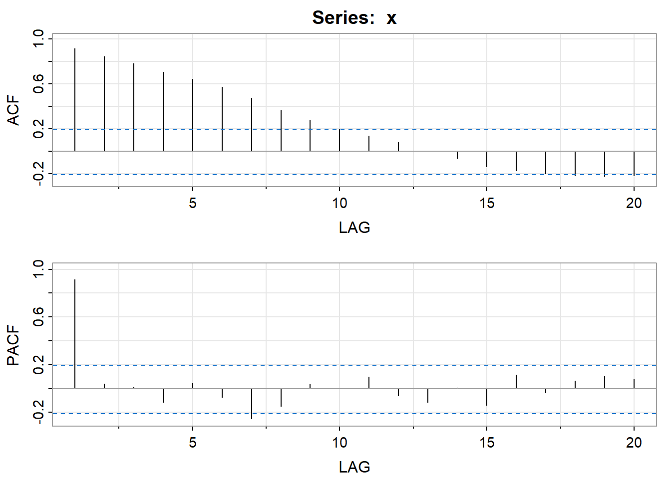 plot(PACF, type="h", xlab="LAG", ylim=c(-.1,1)); abline(h=0)