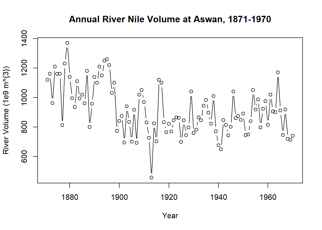 plot(Nile, xlab = "Year", ylab = "River Volume (1e9 m^{3})",