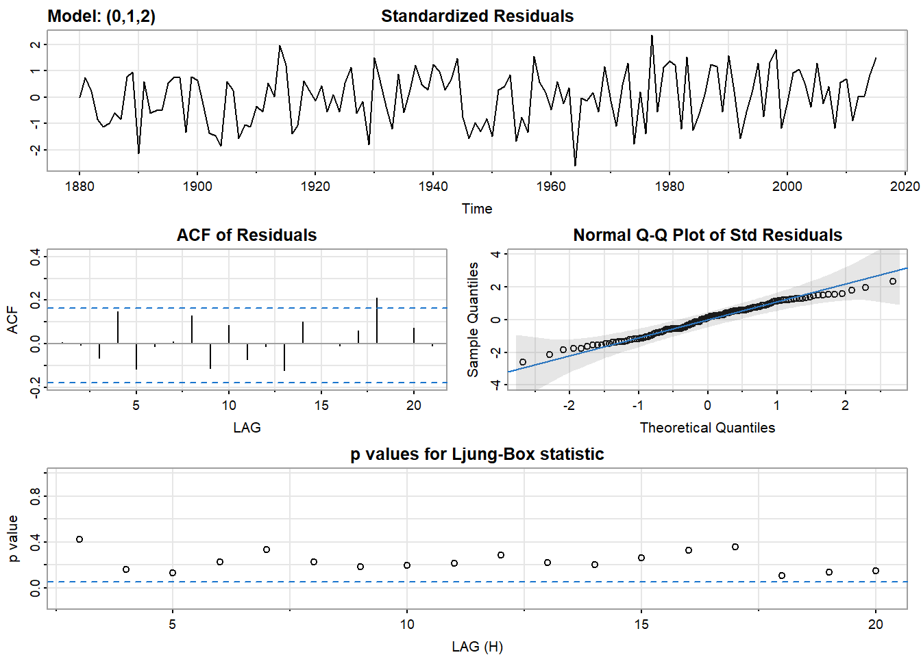 对于一个给定的时间序列y,我们可以使用arima(..., order = c(0, 0, 0))函数来拟合白噪声(WN)模型。回顾一下,WN模型是一个ARIMA(0,0,0)模型。文档