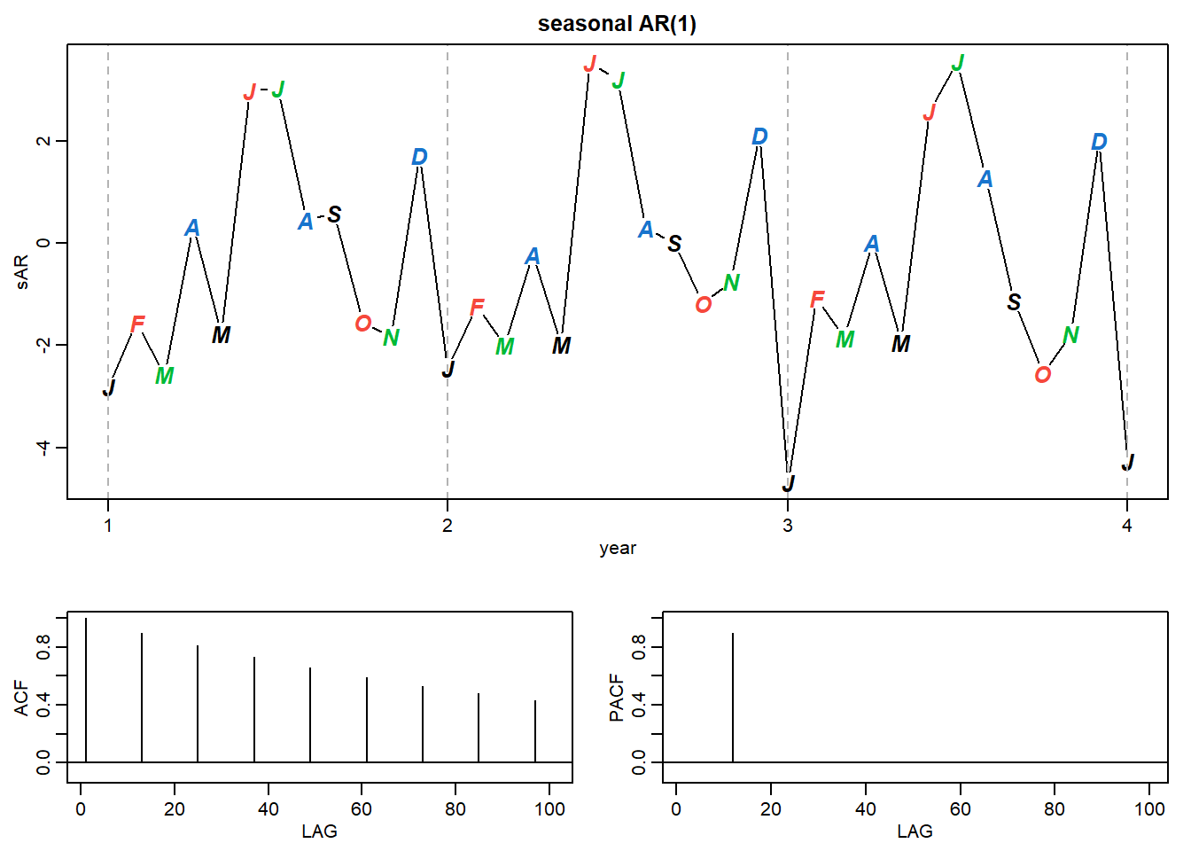 plot(sAR, axes=FALSE, main='seasonal AR(1)', xlab="year", type='c')