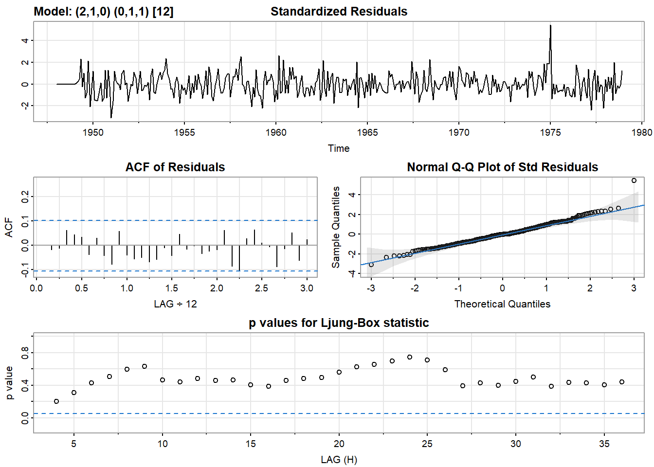 sarima(unemp, p = 2, d = 1, q = 0, P = 0, D = 1, Q = 1, S = 12)