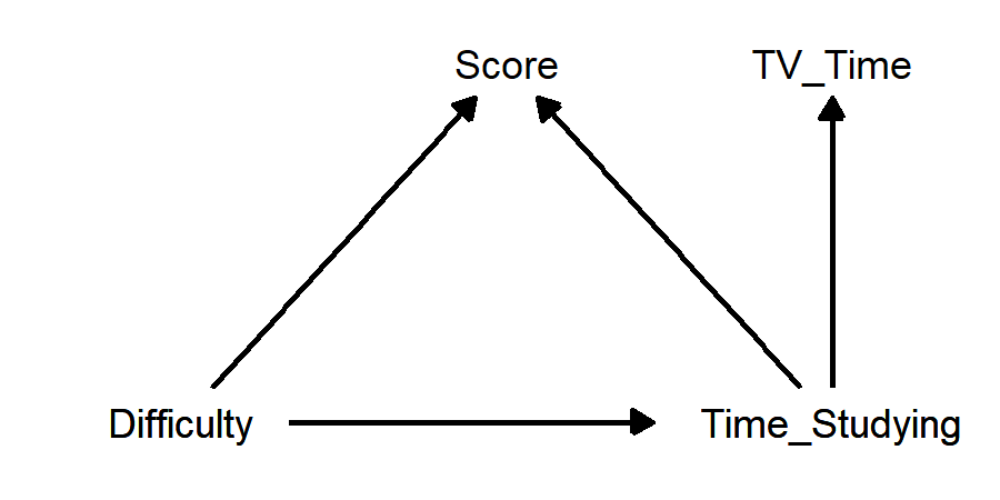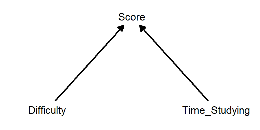 This diagram just shows that amount of time studying and difficulty of exam both affect score. But… doesn’t difficulty also affect how much time is spent studying? Maybe this would be a better diagram:
