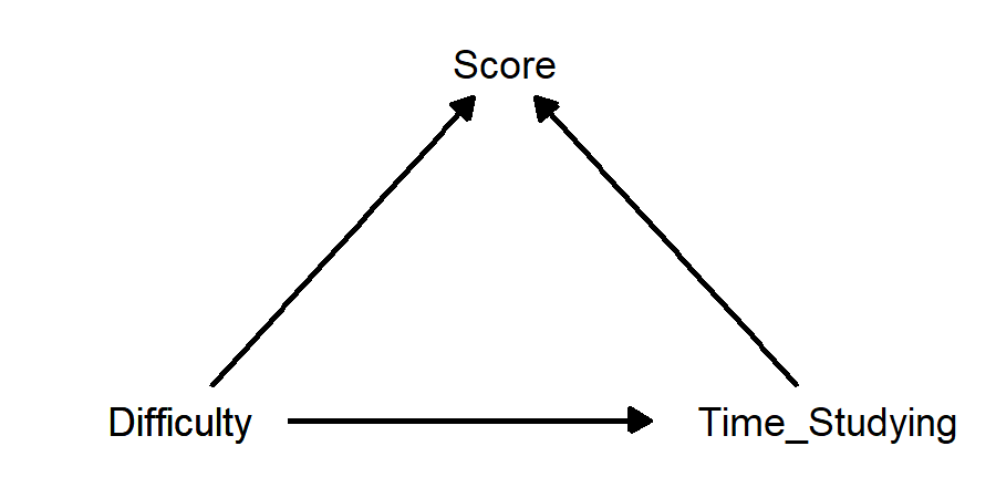 If we are interested in the causal effect of time studying on score, we should probably control for difficulty. This was, we will estimate how much a change in time studying affects score, assuming the difficulty of the exam does not change.