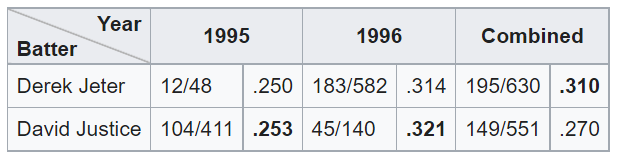This seems paradoxical: how can Justice have a better average in both 1995 and 1996, while Jeter has a better average when combining 1995 and 1996? The explanation is that Justice had far more at-bats in 1995 (411 vs 48), while Jeter had far more at-bats in 1996 (582 vs. 140). Both batters had much better averages in 1996 than in 1995. Jeter was at bat far more often in 1996 than in 1995, while Justice was at bat far more often in 1995 than in 1996.