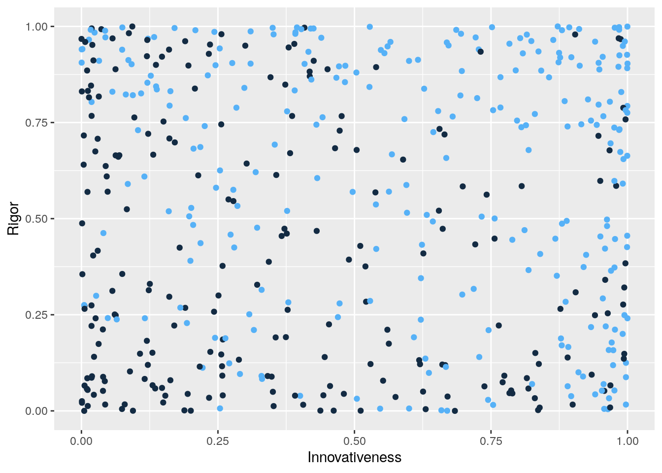 Notice that we have induced a negative association between rigor and innovativeness among those papers that were published. To see this, notice that when innovativeness is low, published papers tend to be higher in rigor. And, when rigor is low, published papers tend to be higher in innovativeness.