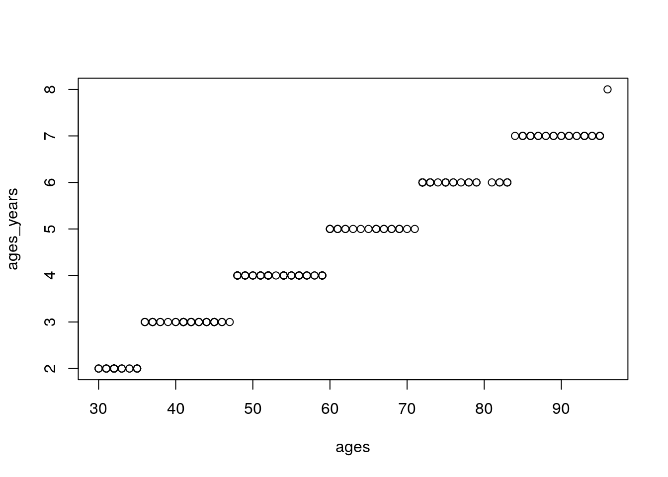heights <- round(30+0.22*ages+rnorm(n=100,mean=0,sd=sd_ages),1)