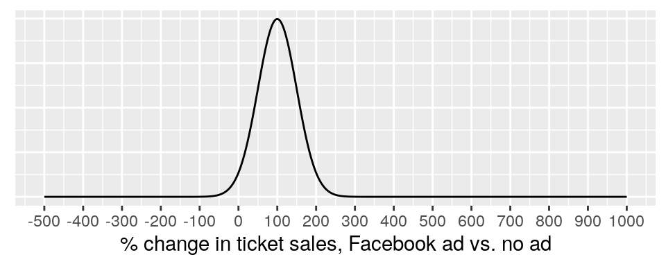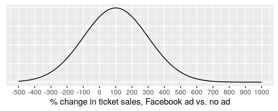 We might also choose a distribution other than normal, since it seems unlikely that the ad will reduce sales. Maybe we find a distribution that gives a long right tail, giving some probability that the ad will have a huge positive effect on sales, but also a short left tail, giving very little probability to the ad being counterproductive to a large degree.
