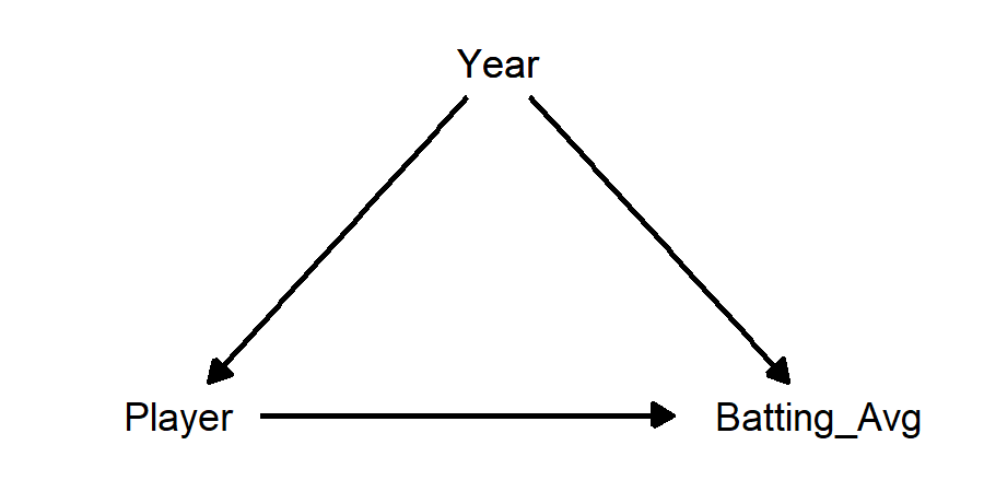 The “confounding” variable here is year (1995 vs 1996). But it seems strange to call this a confounder - did the difference in year cause both batters to improve their averages? Did it cause Jeter to have more at-bats than Justice? Do we buy this causal diagram?