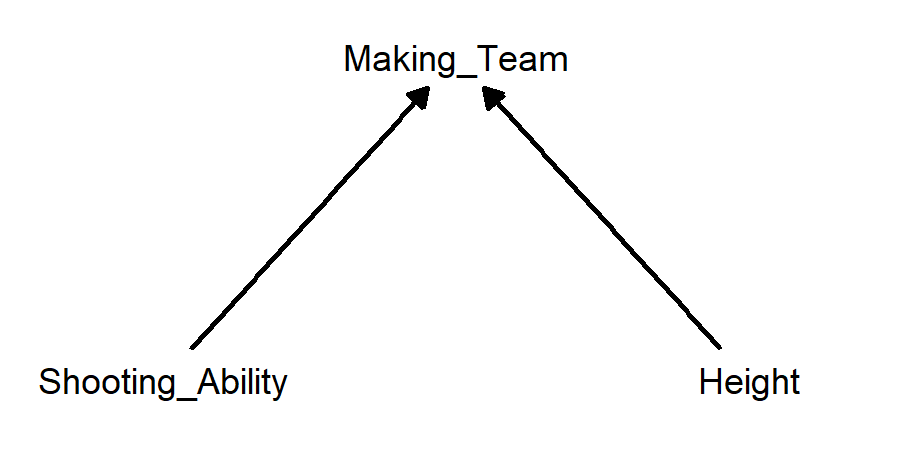Example: players on a basketball team who are shorter tend to have higher shooting percentages for mid-range and long-range shots. The collider variable is making the basketball team. Better shooters are more likely to make the team, and taller players are more likely to make the team. Therefore, if someone who made the team isn’t a very good shooter, they are more likely to be tall, and if someone who made the team isn’t very tall, they are more likely to be a good shooter.