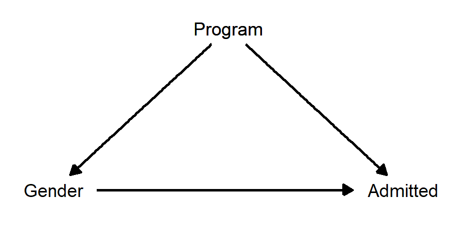 Because Program is affecting both Gender and Admitted, we should obviously control for it, which would then allow us to estimate the direct effect of Gender on Admitted without the bias introduced by Program.