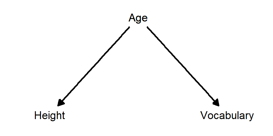 Example: taller children have larger vocabularies. The confounding variable is age: as children grow older, they get taller and they learn more words.