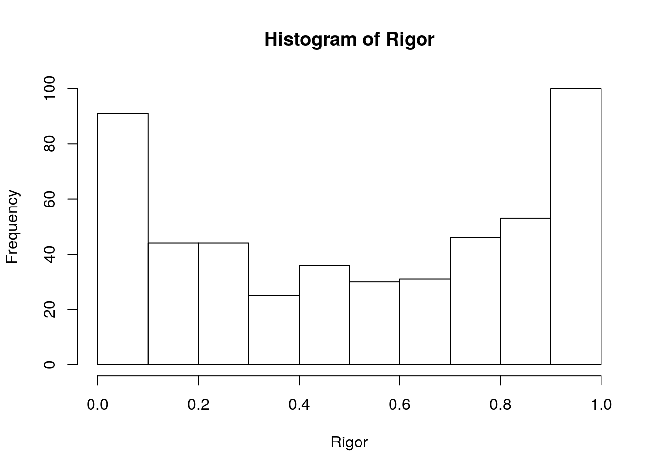 Oh no, what have we done??? Now the slope estimate for Rigor is much larger, in raw terms and relative to its standard error. The p-value is below the magic line, and \(R^2=0.023\). This isn’t a very impressive \(R^2\) on its own, but it is much larger than the \(R^2=0.0004\) from the first model.