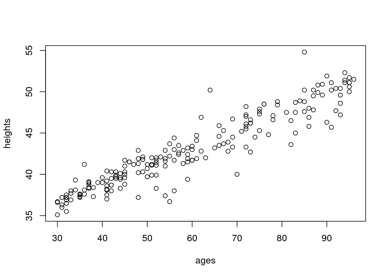 heights <- round(30+0.22*ages+rnorm(n=100,mean=0,sd=sd_ages),1)