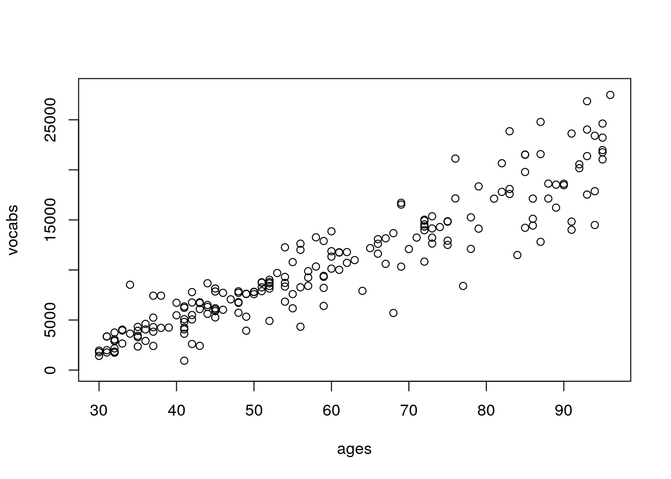 vocabs <- round(-7000+300*ages+rnorm(n=100,sd=sdvocabs),0)
