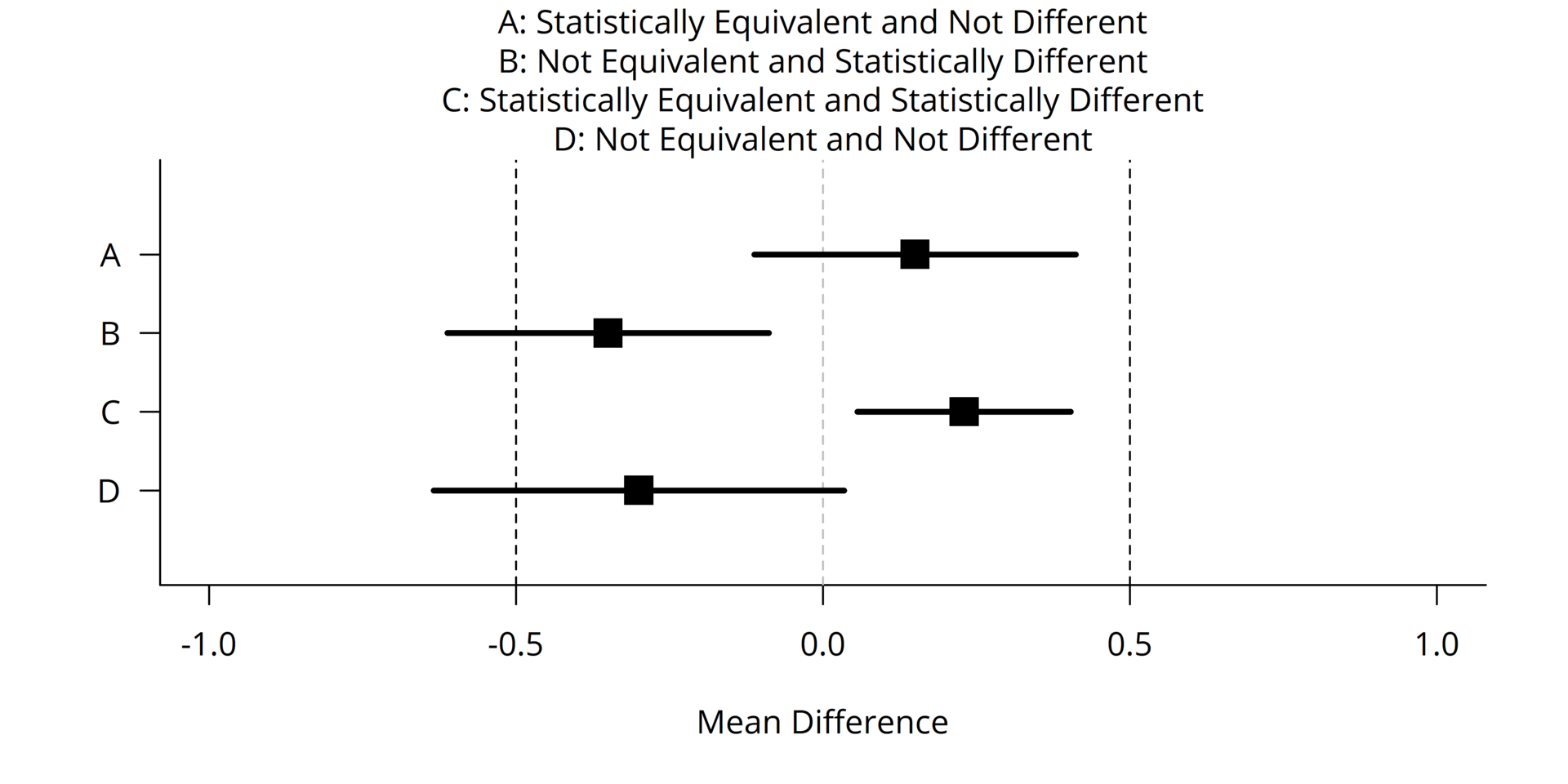 A: \(H_0: \mu_1-\mu_2\leq0\) (the “composite” null) B: \(H_0: \mu_1-\mu_2=0\) (the “point” null)
