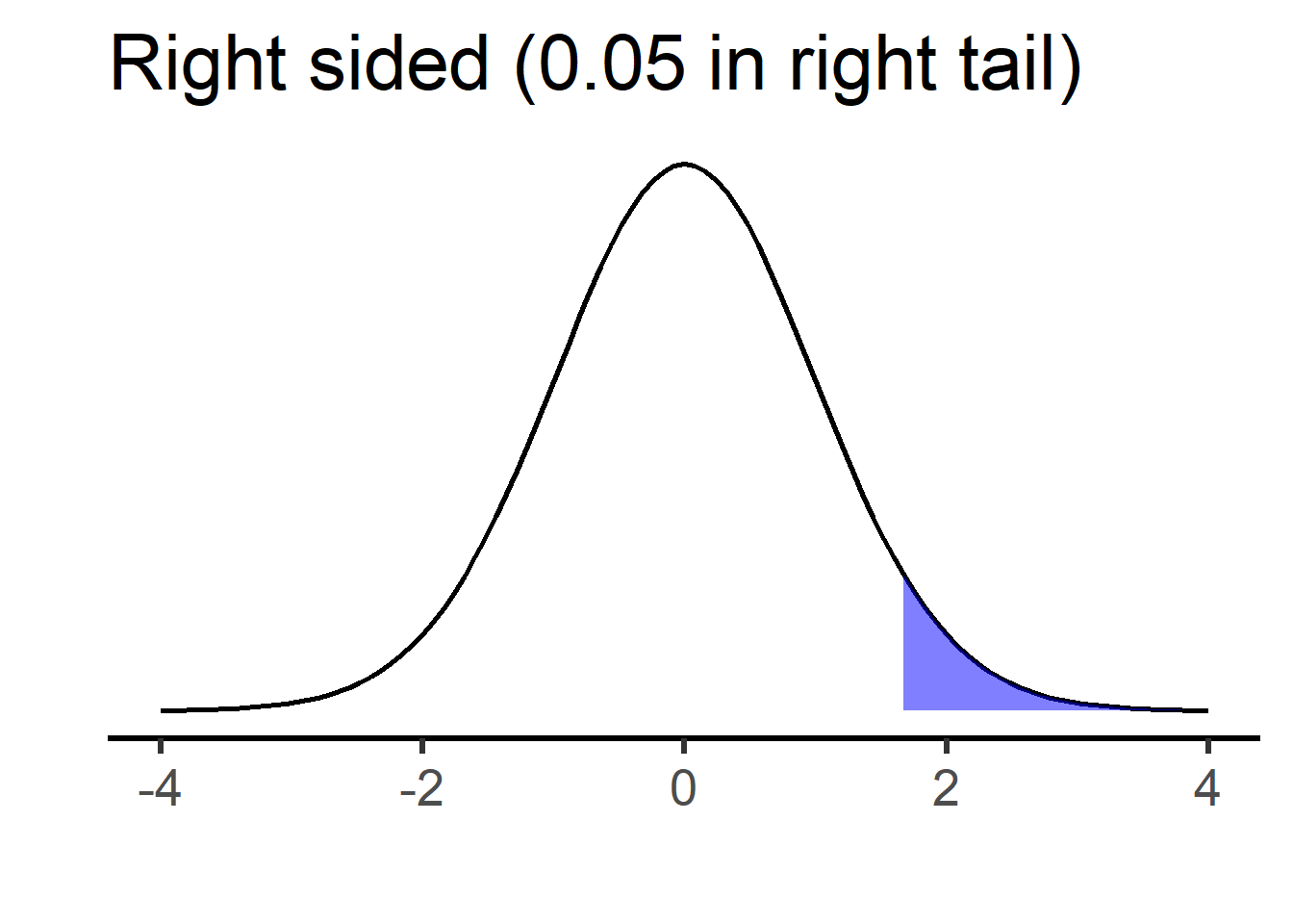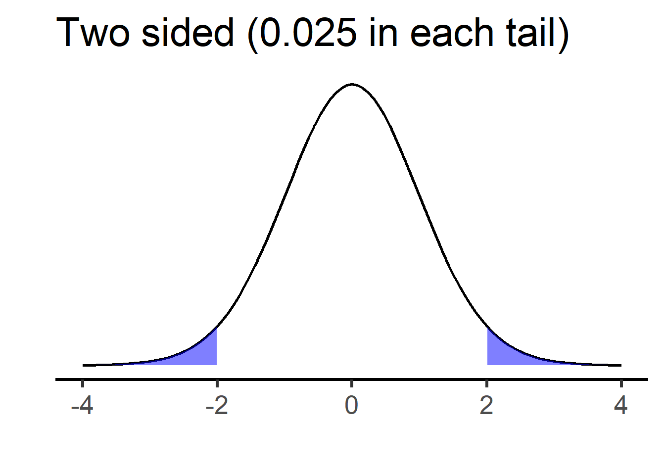 Some popular parameters can show the “direction” of an effect via sign. For instance, \(\mu_1-\mu_2\) is negative if \(\mu_2>\mu_1\) and positive if \(\mu_1>\mu_2\). A “two-sided” alternative allows \(H_0\) to be rejected for both negative and positive effects. A “one-sided” alternative states a single direction, and \(H_0\) is only rejected when the parameter’s direction is in line with the alternative (e.g. \(\bar{x}_1>\bar{x}_2\) cannot reject \(H_0\) if \(H_A\) says \(\mu_1-\mu_2<0\)).