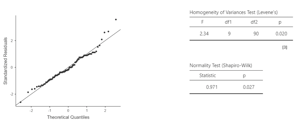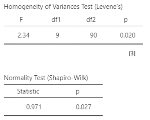 • I personally do not recommend paying attention to Levene’s “homogeneity of variances” test, nor to the Shapiro-Wilk normality tests