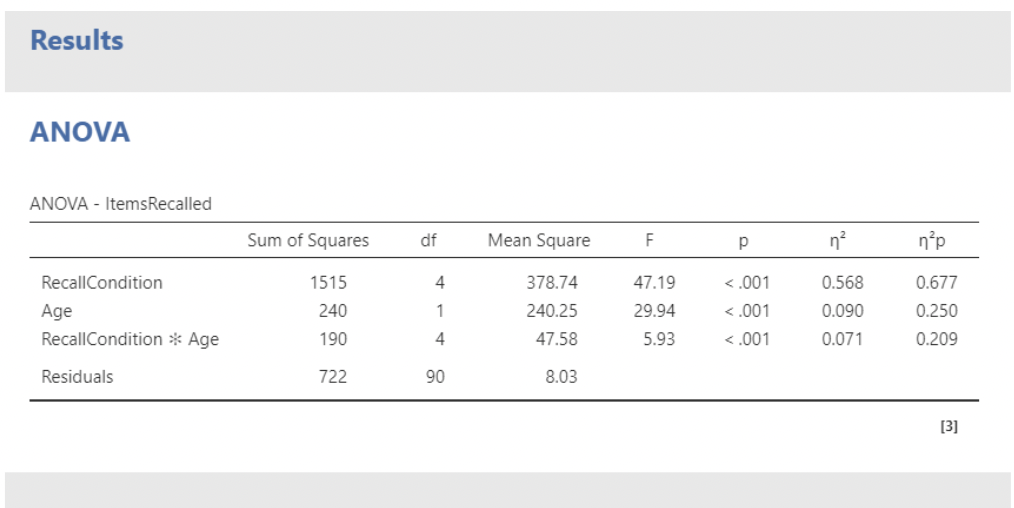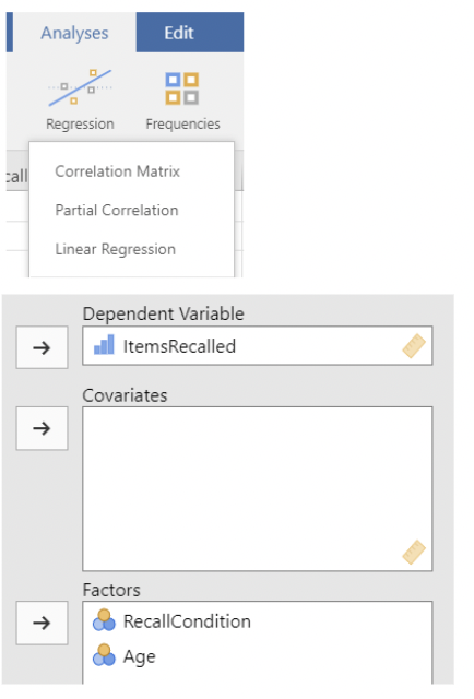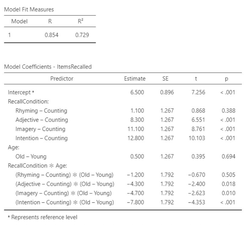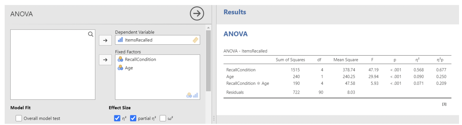 • First we’ll use ANOVA, using items recalled as the response (dependent) variable, and recall condition and age as factors. Note that jamovi automatically includes their interaction.