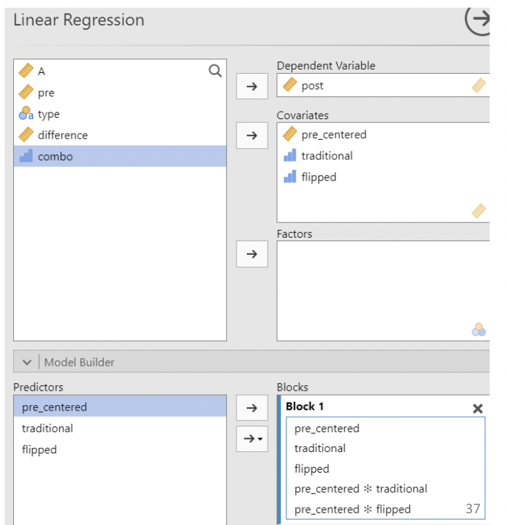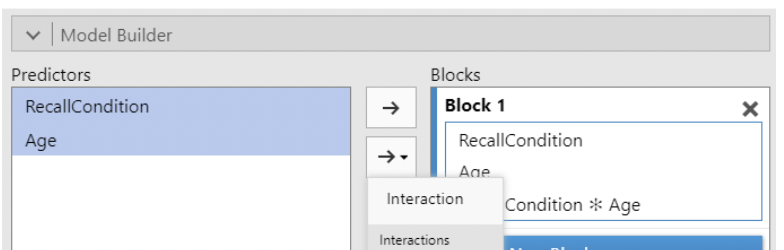 • Finally, the interaction must be specified under “model builder”; jamovi does not create regression interactions by default.