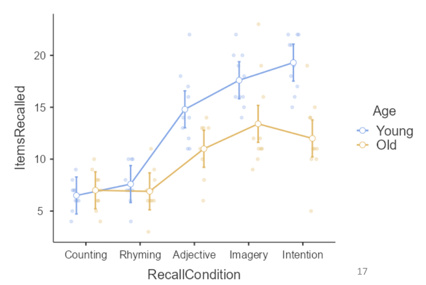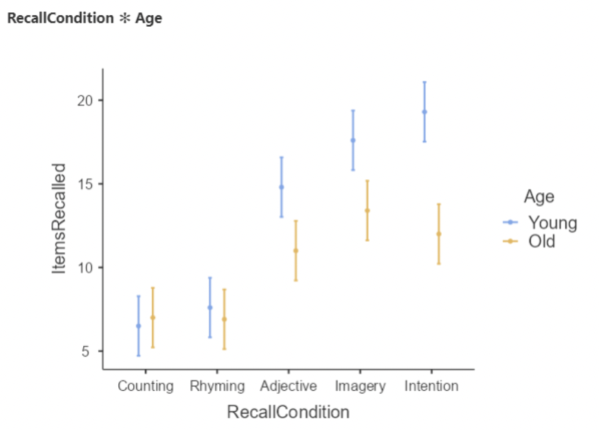 • Here we see that mean items recalled for young people is substantially higher than for old people in the last three conditions, but differs only slightly in the first two conditions.