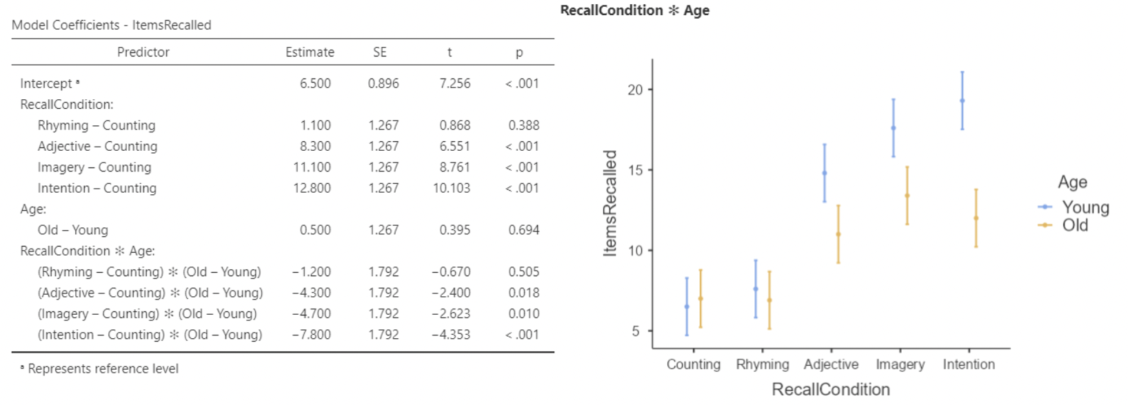 • So, when RecallCondition = Counting, the mean items recalled for Age = Old is larger than for Age = Young. But for all other recall conditions, the interaction slopes turn this negative, and mean items recalled is larger for younger participants.