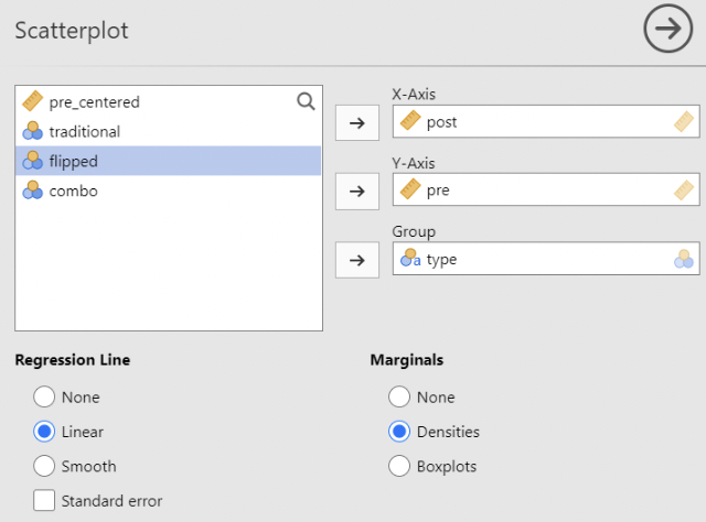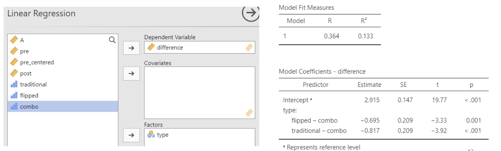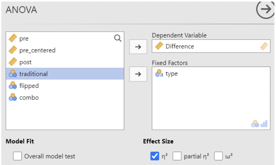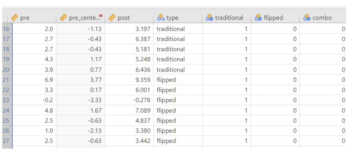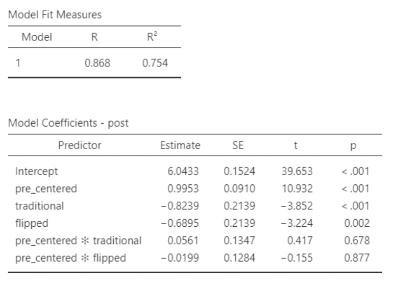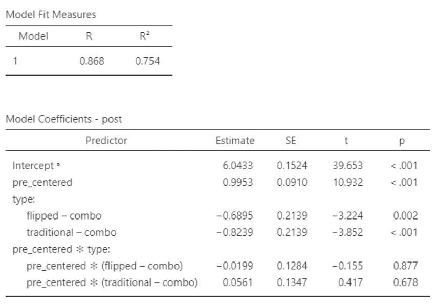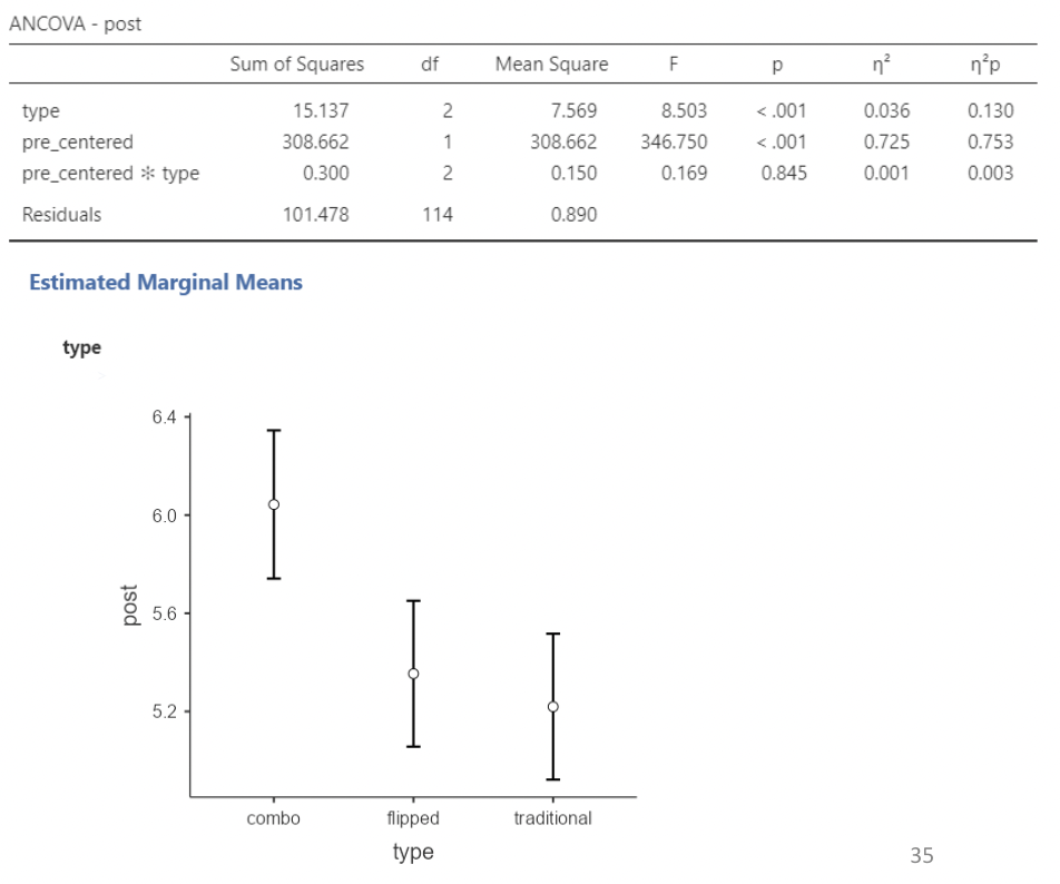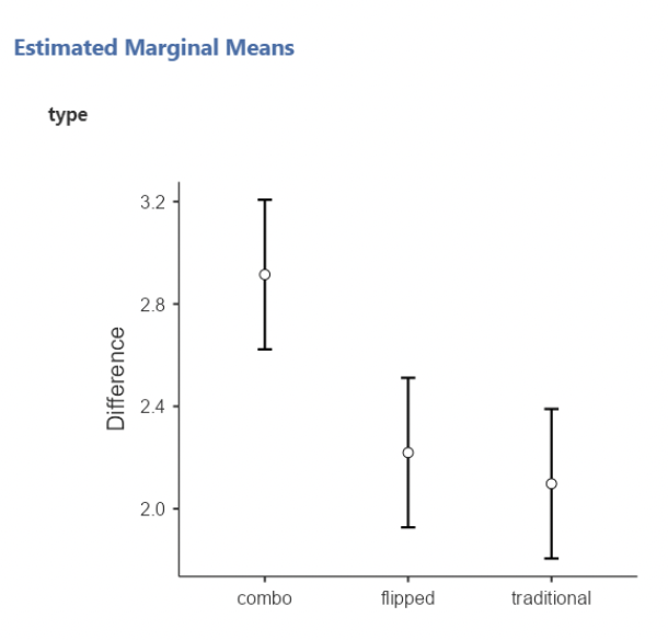 • This agrees with the ANOVA results from the previous slide: we have a statistically significant difference in mean test score differences (post – pre) when comparing “combo” to “flipped” or “traditional”. And \(R^2 = \eta^2\)!