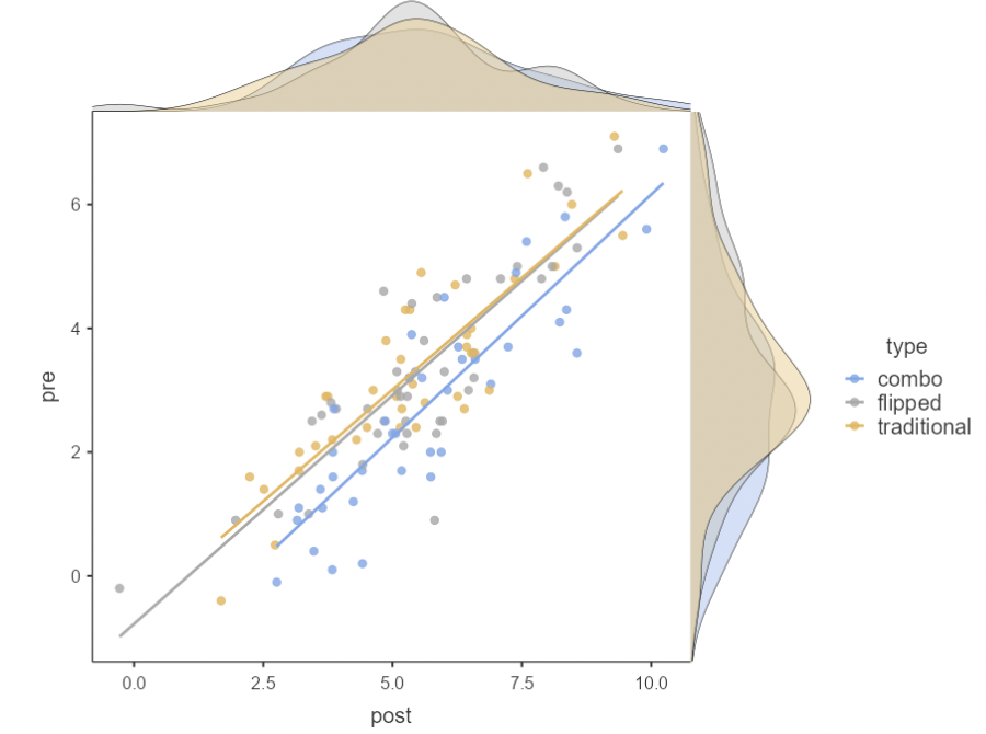 • But, these methods are not answering the exact same question. Using pre-test as a covariate, we answer the question “what difference do I expect in post-test scores when comparing two students with the same pre- test score but different teaching types”?