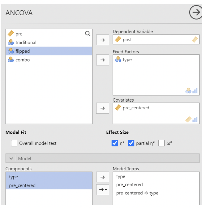 • Notice that the effect size for pre- score is far greater than the effect size for type, or for the interaction. This is not surprising.