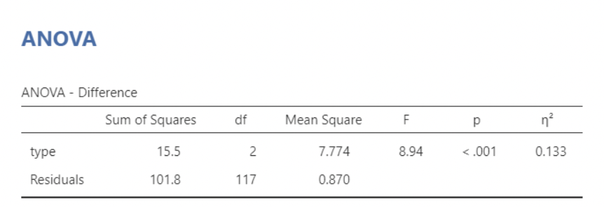 • I personally prefer \(\eta^2\), as their sum cannot exceed \(1\). Some prefer \(\eta^2p\), because it quantifies the “effect” of a factor relative to remaining unexplained variance,
