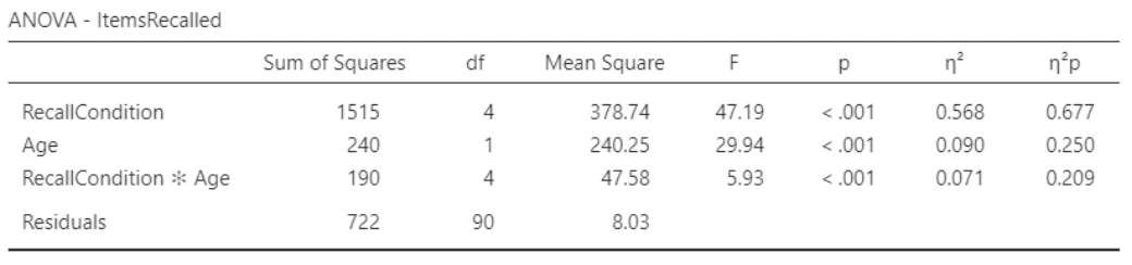 • Here, we see that recall condition explains the most variance by far, followed by age, followed by their interaction.