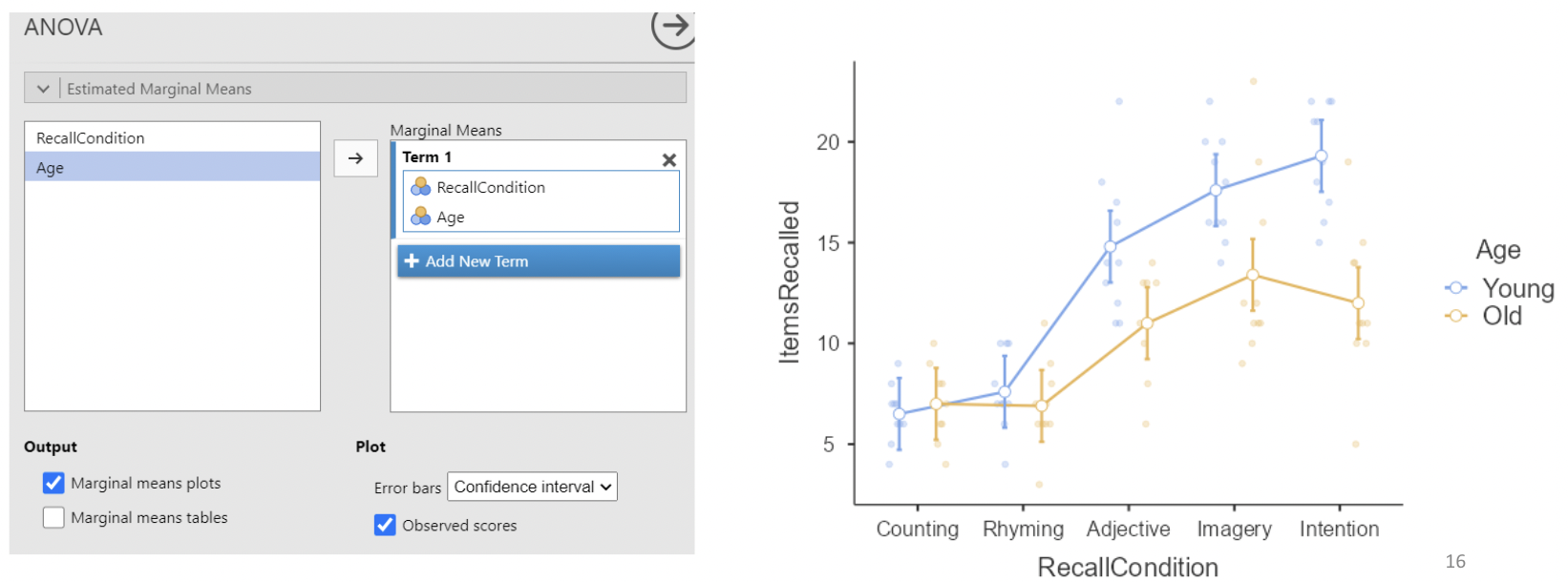 • This plot shows every combination of means across recall condition and age. It also has 95% CIs around each mean, and raw data displayed.